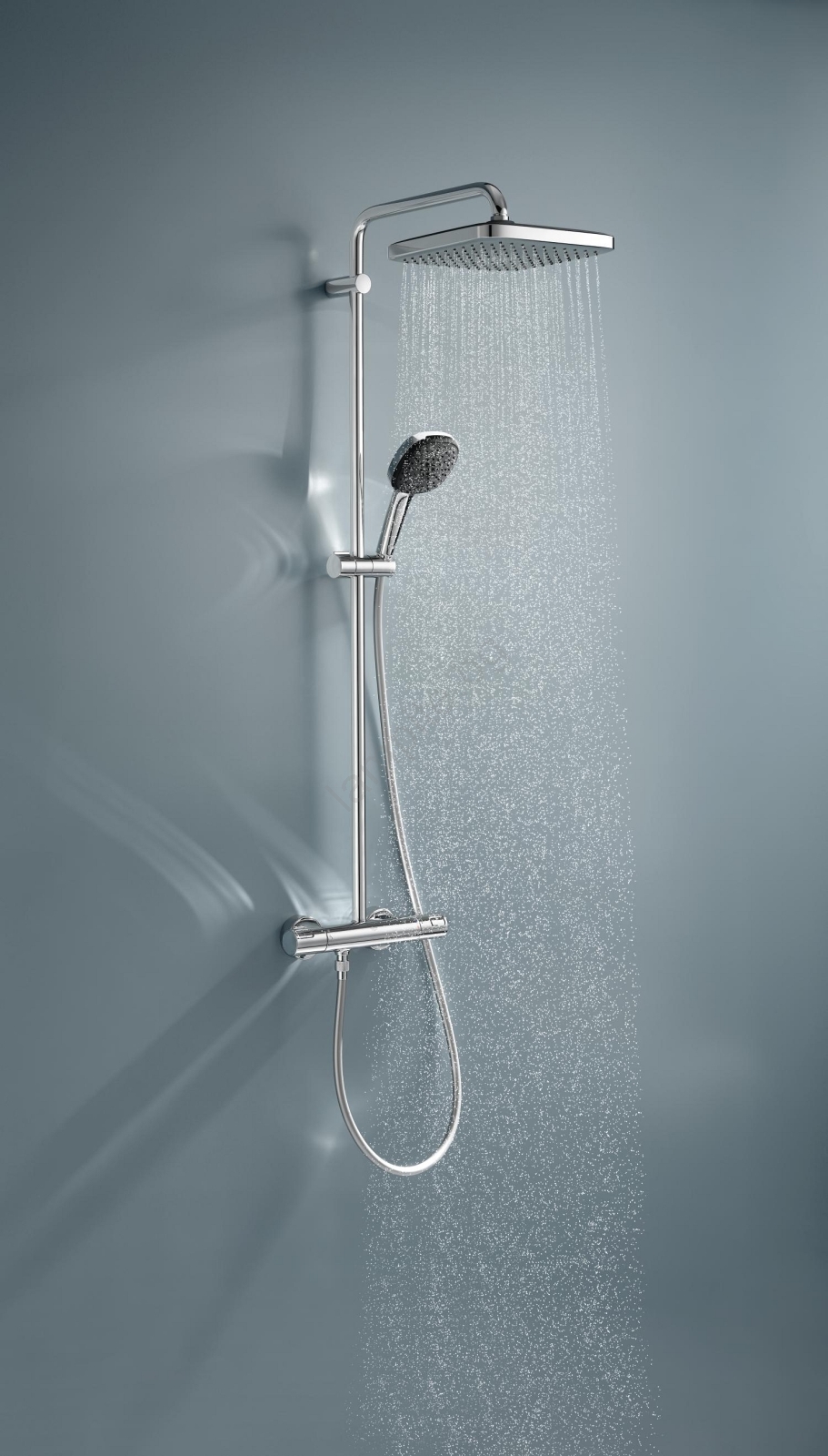 • Стенен термостатен смесител с функция Aquadimmer позволява лесно превключване между надглавна и ръчна душ глава.