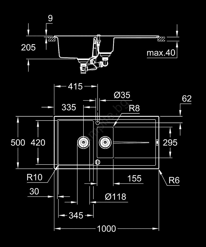 • Размери на мивката: 1000 x 500 mm, подходяща за шкафове от 600 mm.
