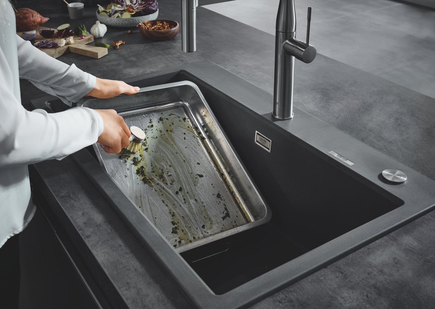 • Просторна композитна мивка GROHE K700 с размери 780 x 510 мм за максимален комфорт при работа в кухнята.