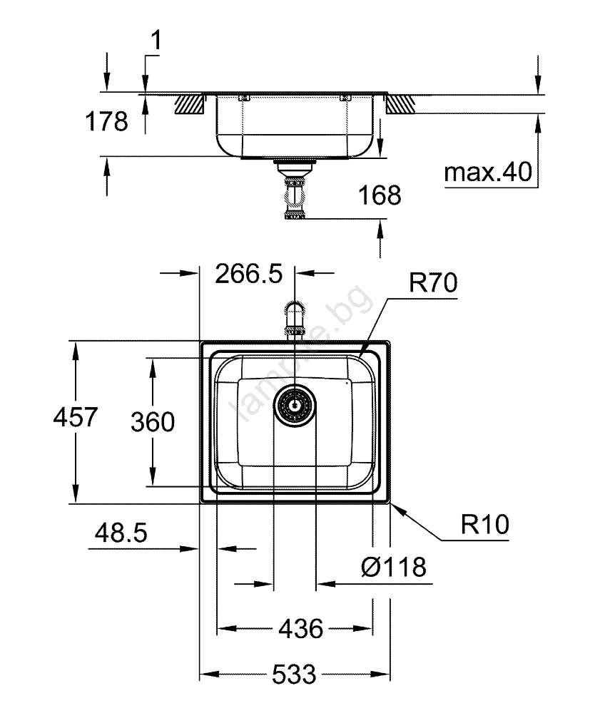 • Отточен отвор Ø 3,5" (90 mm) с кошничка за отпадъци.