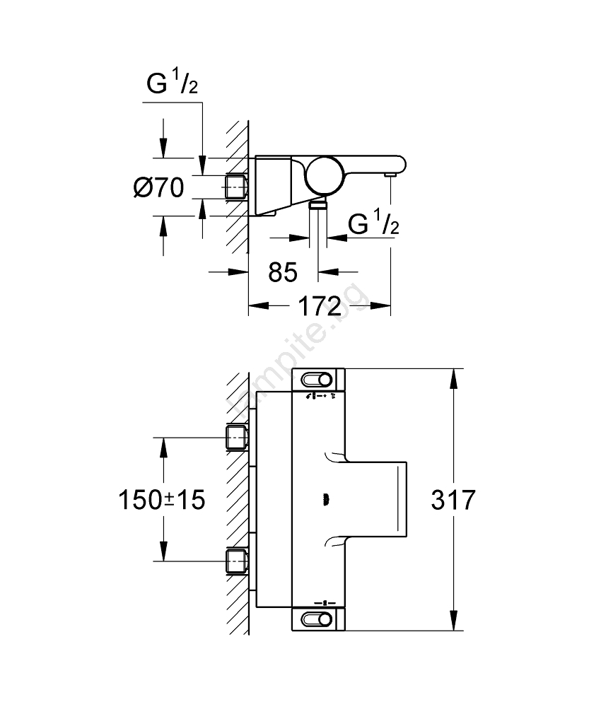 • Стенно термостатично смесител за вана за прецизно регулиране на температурата на водата.