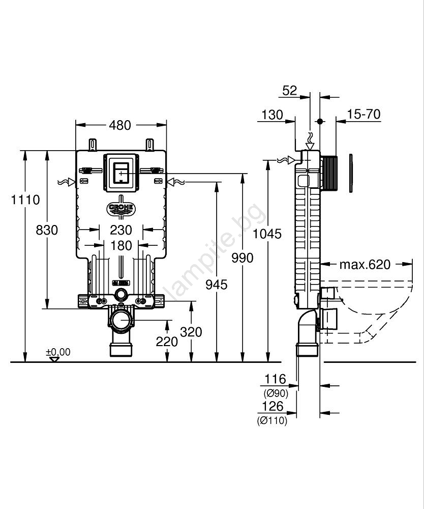 • Включва предстенен инсталационен елемент GROHE Uniset за тоалетна (38 643 001).