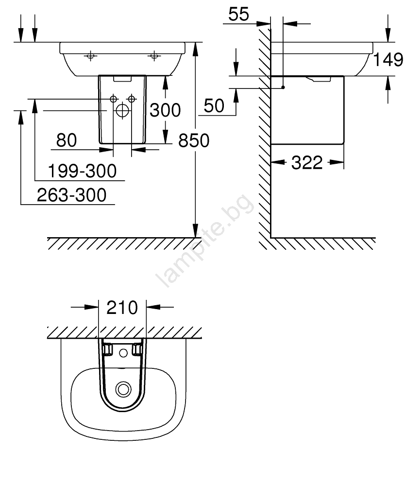 • Размери: ширина 210 mm, дълбочина 300 mm, височина 322 mm, подходящ за различни размери умивалници.