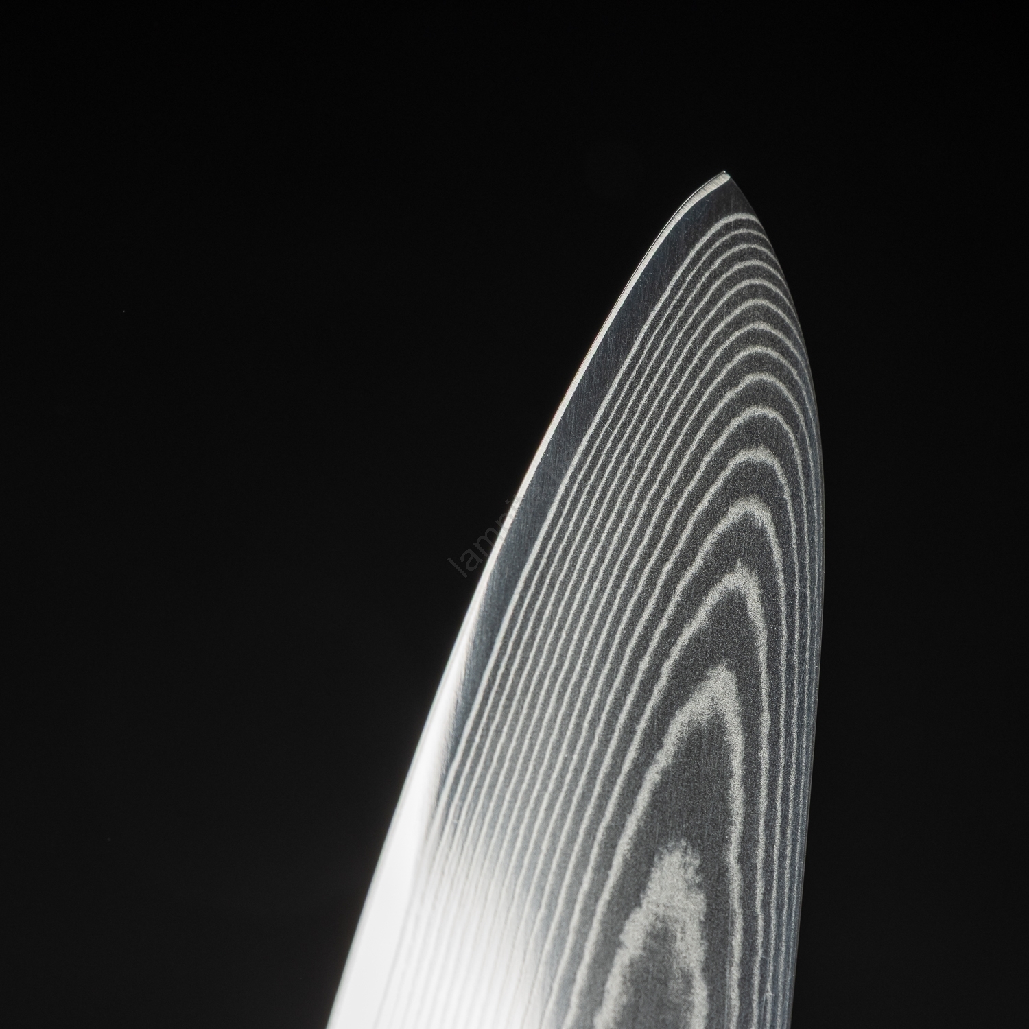 • Острие с дължина 200 mm е изработено от 67 слоя дамаскова стомана с ядро от VG10 – първокласна японска стомана, известна със своята изключителна твърдост, издръжливост и дълготрайна острота.