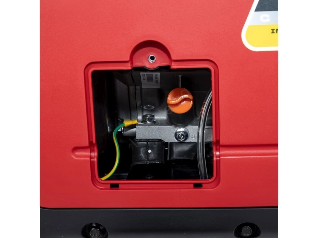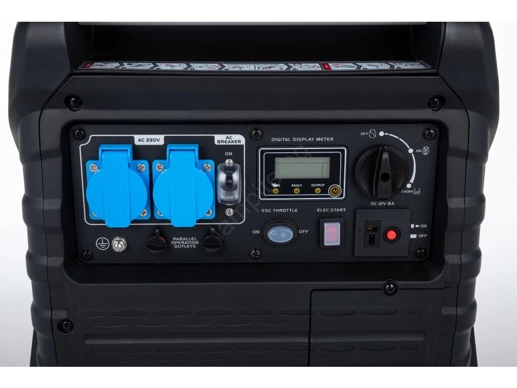 • Управлението е лесно благодарение на контролния панел, където ще намерите индикатори за работното състояние: защита от претоварване и късо съединение, защита от недостиг на масло, бутон за нулиране на системата за управление и възстановяване на захранването, връзка за паралелно свързване на генератори, бутон за стартиране и спиране на централната станция и контакт