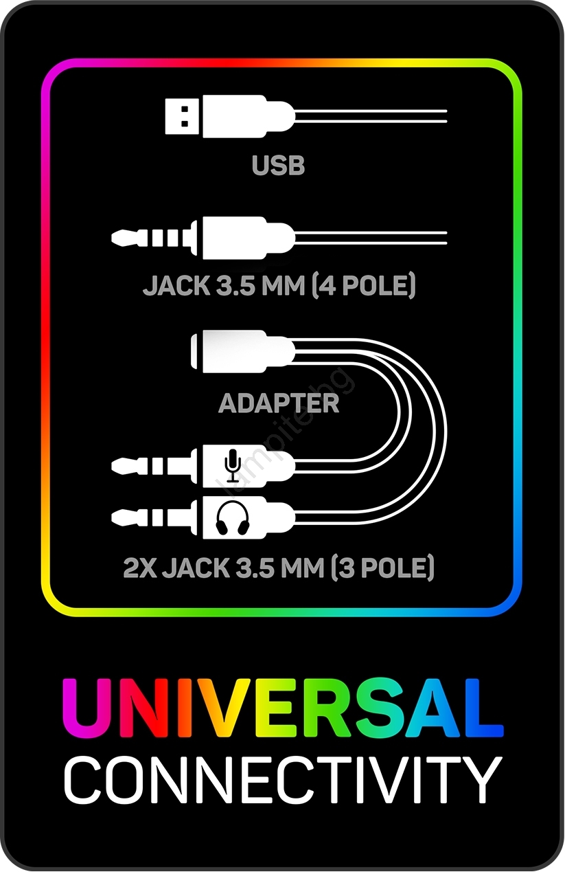 • В комплекта е включен 3,5 мм жак адаптер за максимална съвместимост и комплект промо стикери от гейминг серията NEO.