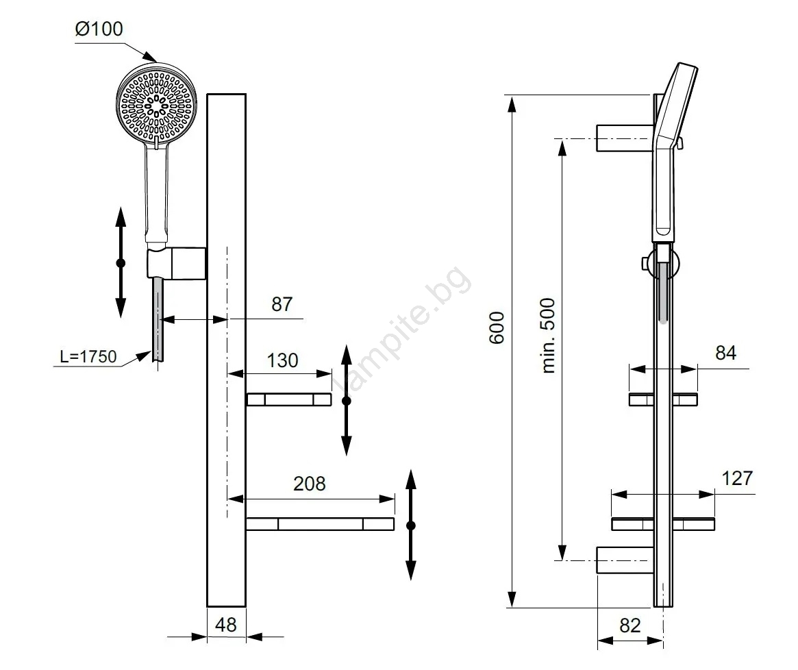 • Душовата тръба има обща дължина 600 mm и минимално разстояние между монтажните точки 500 mm.