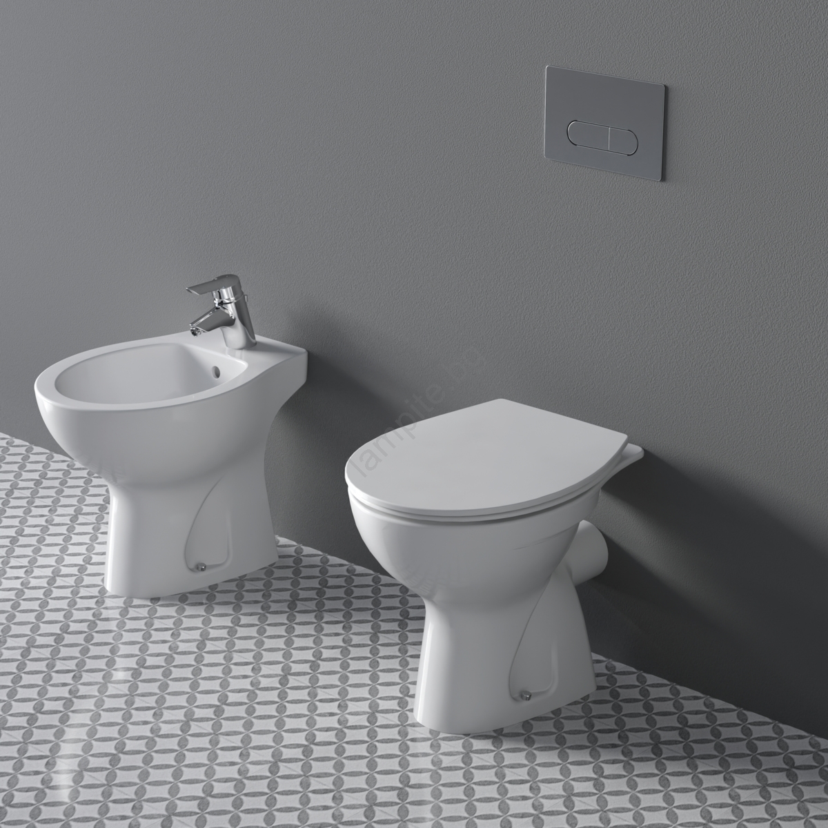 • Подово стоящата тоалетна чиния е изработена от висококачествена санитарна керамика в бял цвят.