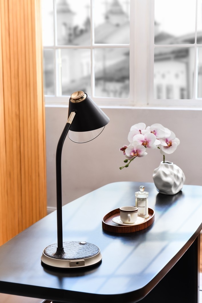 • Мобилен телефон (с поддръжка на безжично зареждане) започва да се зарежда при просто поставяне на основата на лампата.