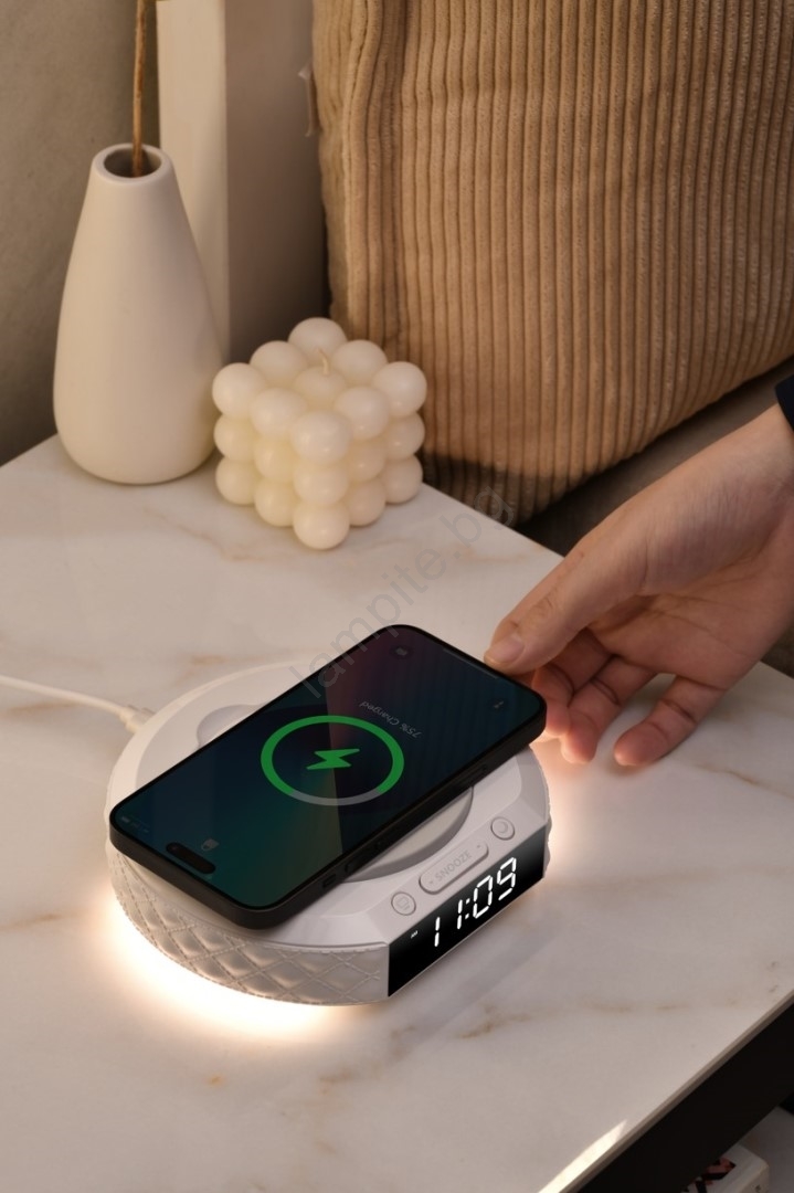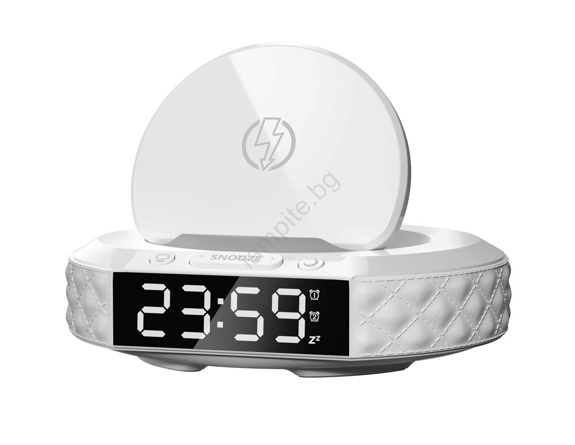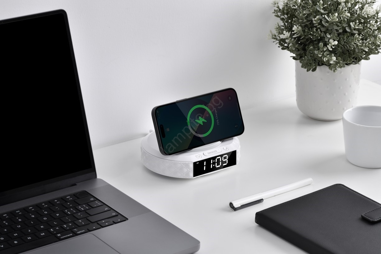 Будилник с LCD дисплей и безжично Qi зарядно 27W/9V 220 mAh бял