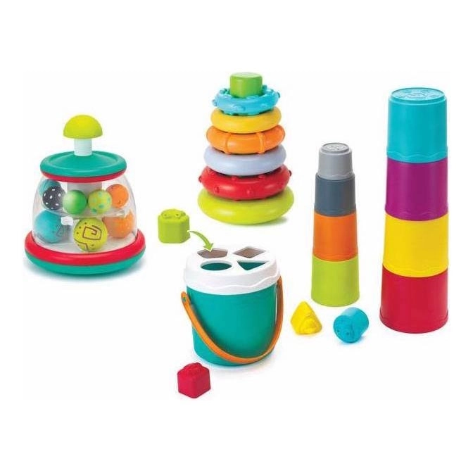 • Сглобяеми чашки в кофа - осем цветни чашки, които могат да се подреждат до височина 70 см или да се поставят една в друга + кофа с капак, в който има отвори с четири различни форми, пасващи на четири цветни кубчета.