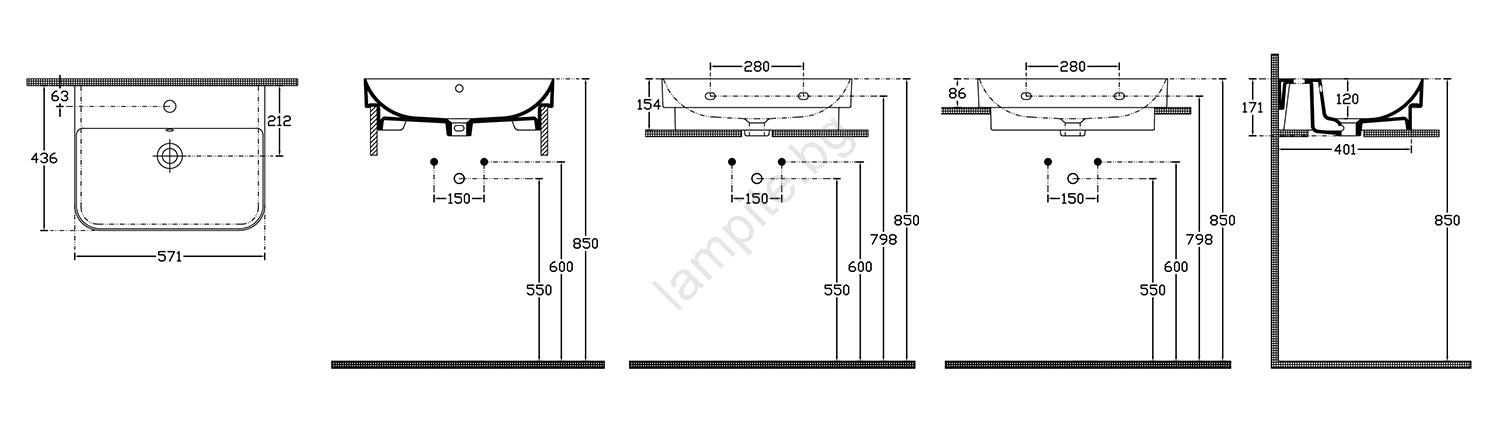 • Мивката може да се монтира на стената, да се постави върху плот или да се вгради в плота.