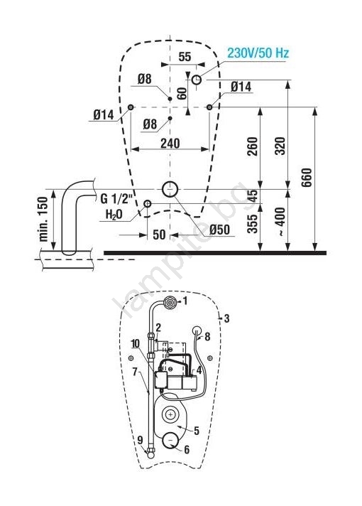 • С вътрешно захранване и заден отвод за чист монтаж със скрити инсталации в стената.