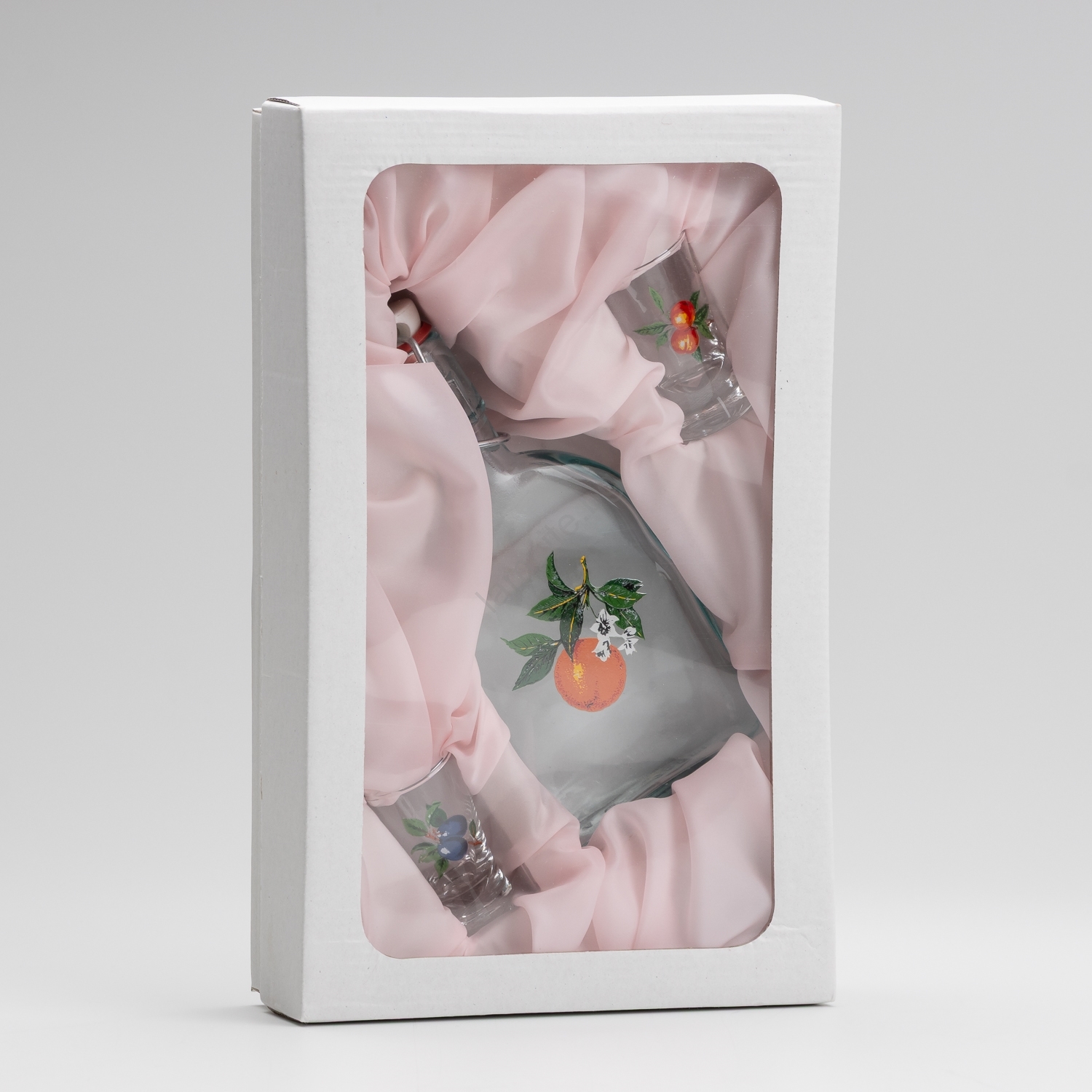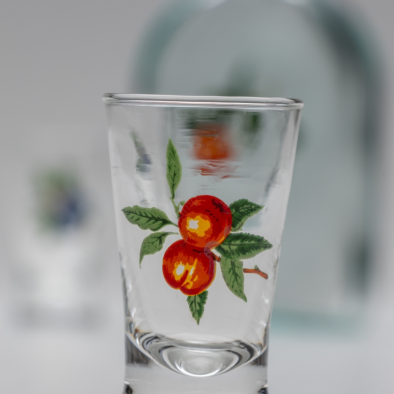 • Стъклен комплект, подходящ за домашен ликьор, в прозрачен цвят с мотив на кайсия.