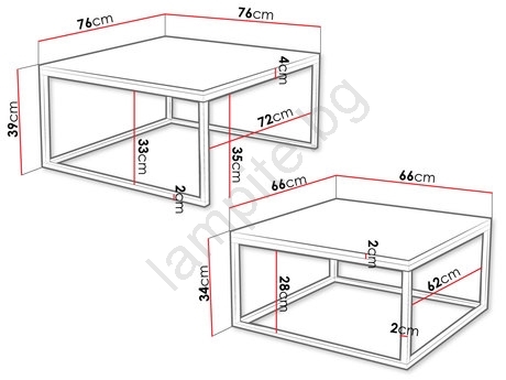 • Размери на по-малката маса: 66 x 66 x 34 см.