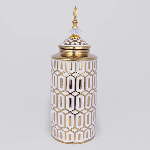 • Златистият цвят подчертава контурите на модела и капака, придавайки на вазата луксозен и изискан вид.