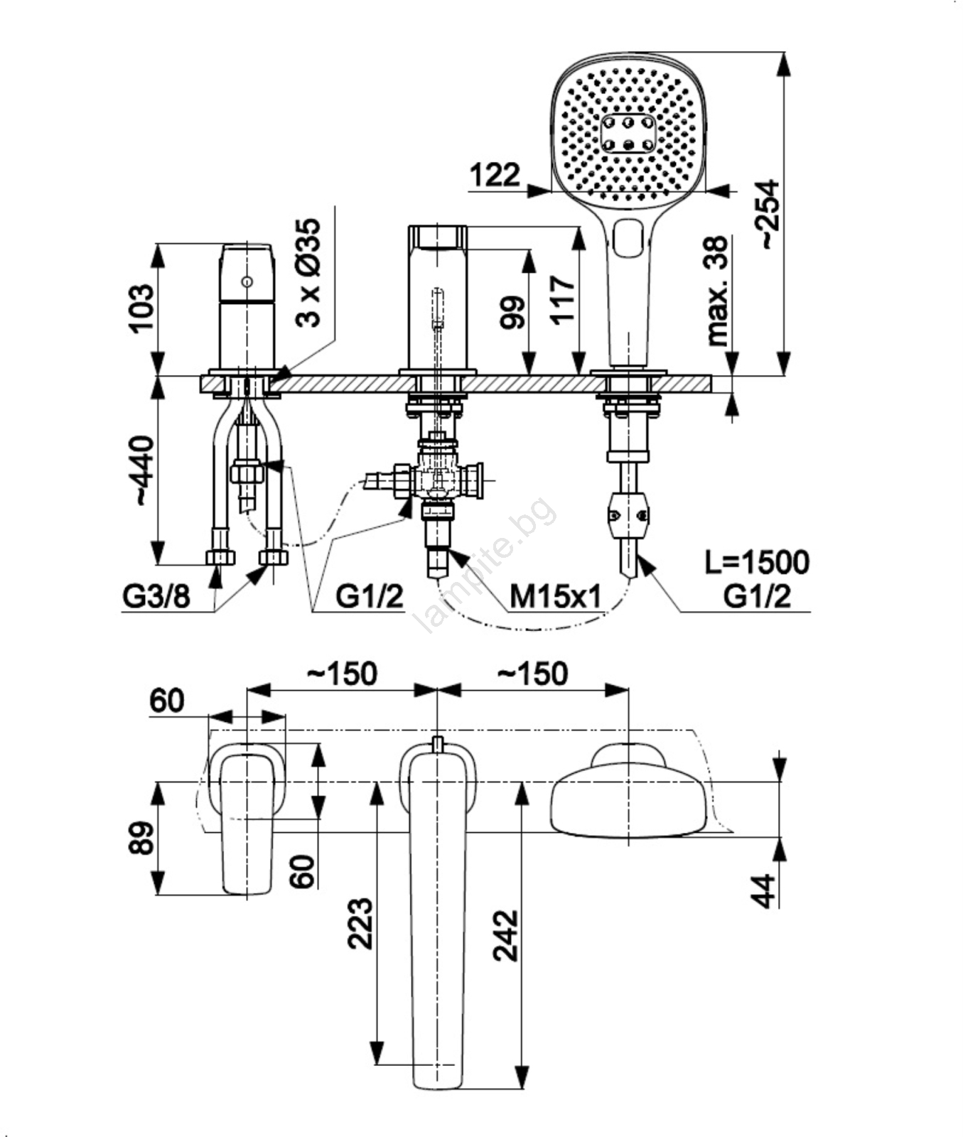 • Този 3-отворен смесител за вана е елегантно допълнение към всяка баня.