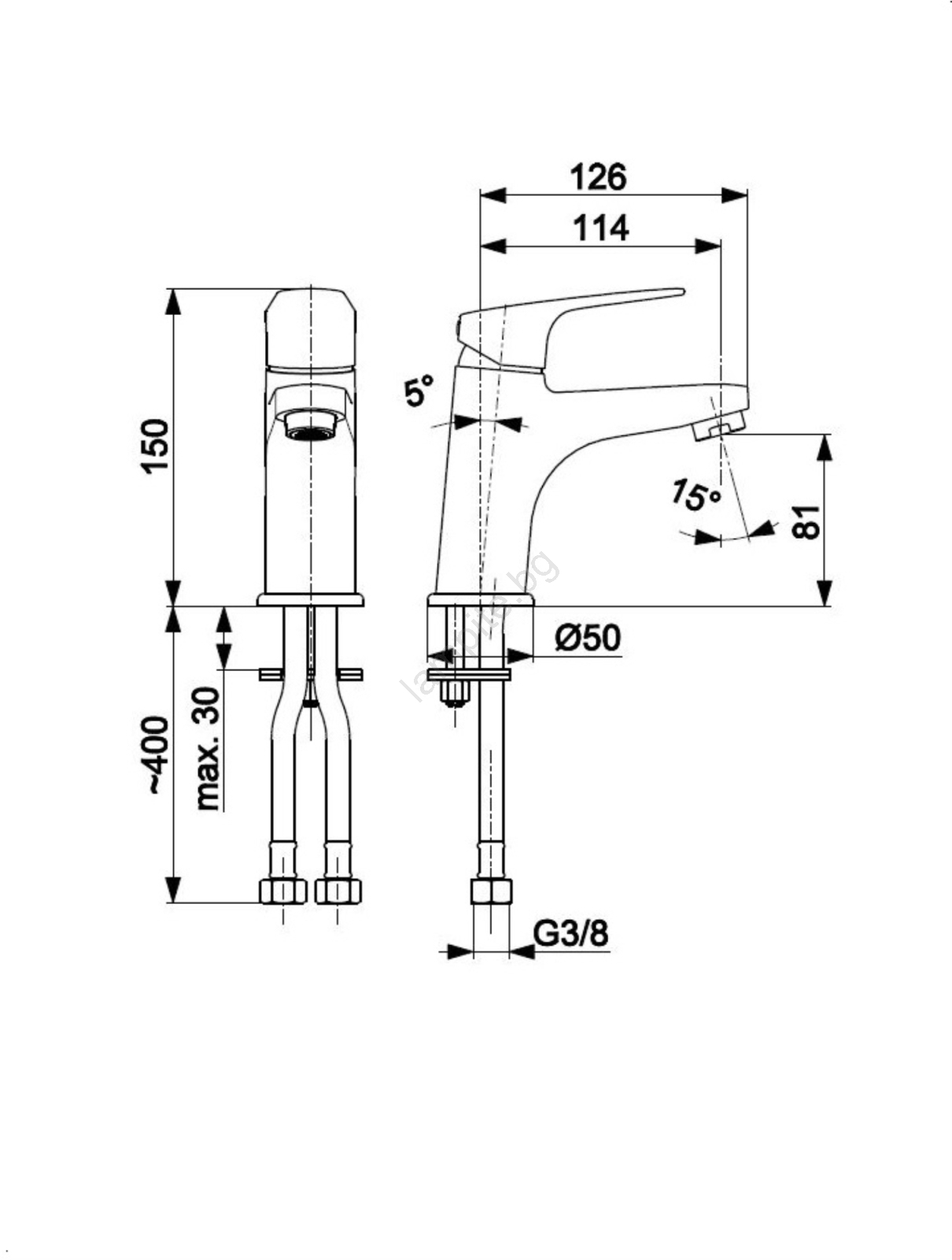 • Опаковката съдържа: малък click-clack сифон с преливник, монтажен комплект с уплътнения, гъвкави маркучи M10x1/G3/8" (L=450 мм, 2 бр.).