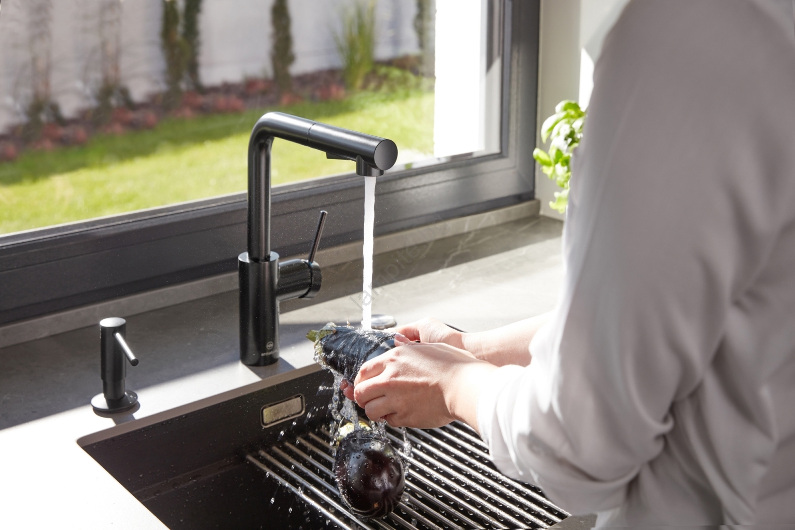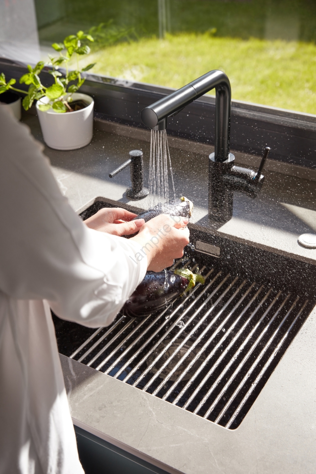 • Практичната изтегляща се душ глава значително улеснява миенето на съдовете и цялата мивка.
