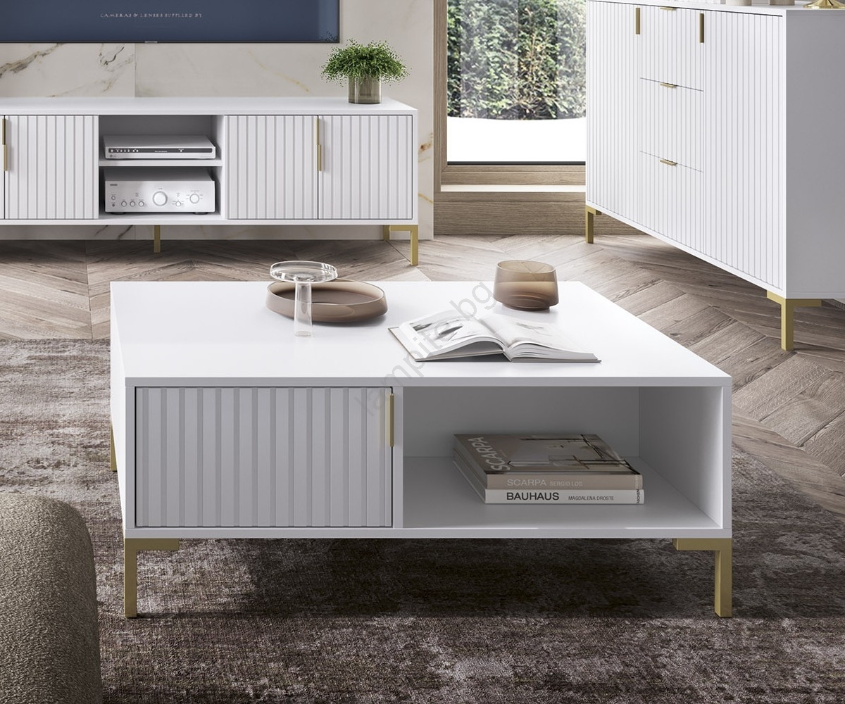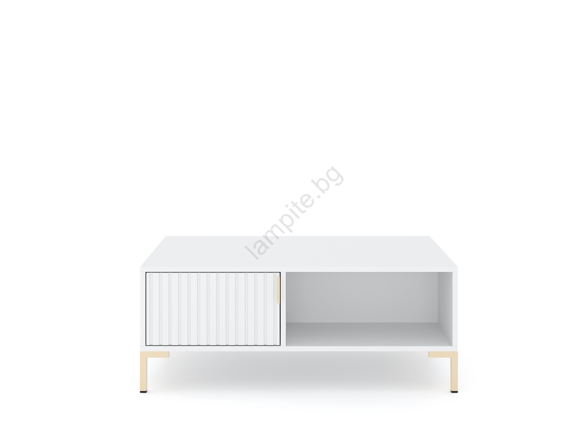 • Разполага с две открити рафта и две чекмеджета, декорирани с вертикално ребристо оформление за изискан визуален ефект.
