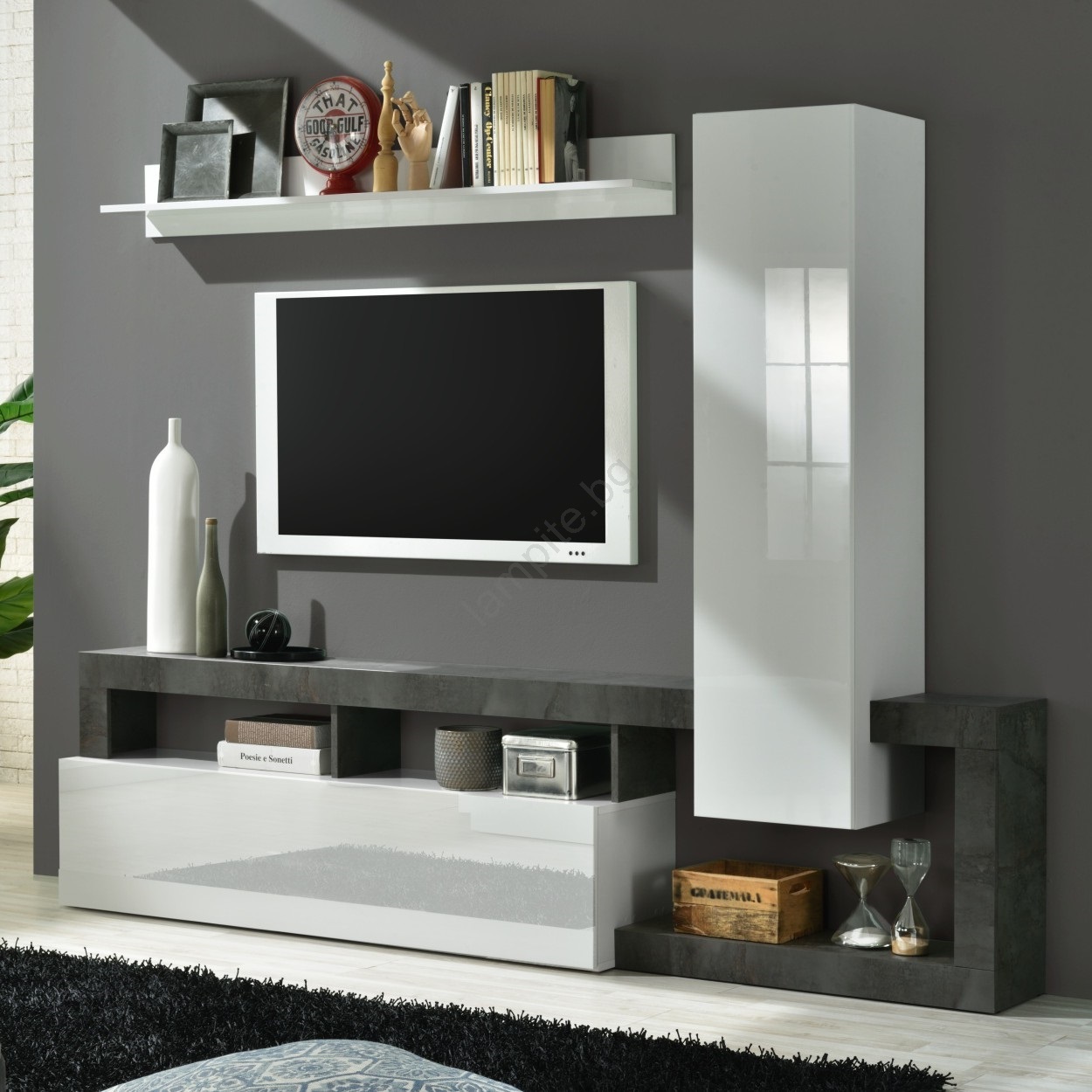 • Плаващи рафтове над телевизора осигуряват място за подреждане на снимки и дребни декорации.