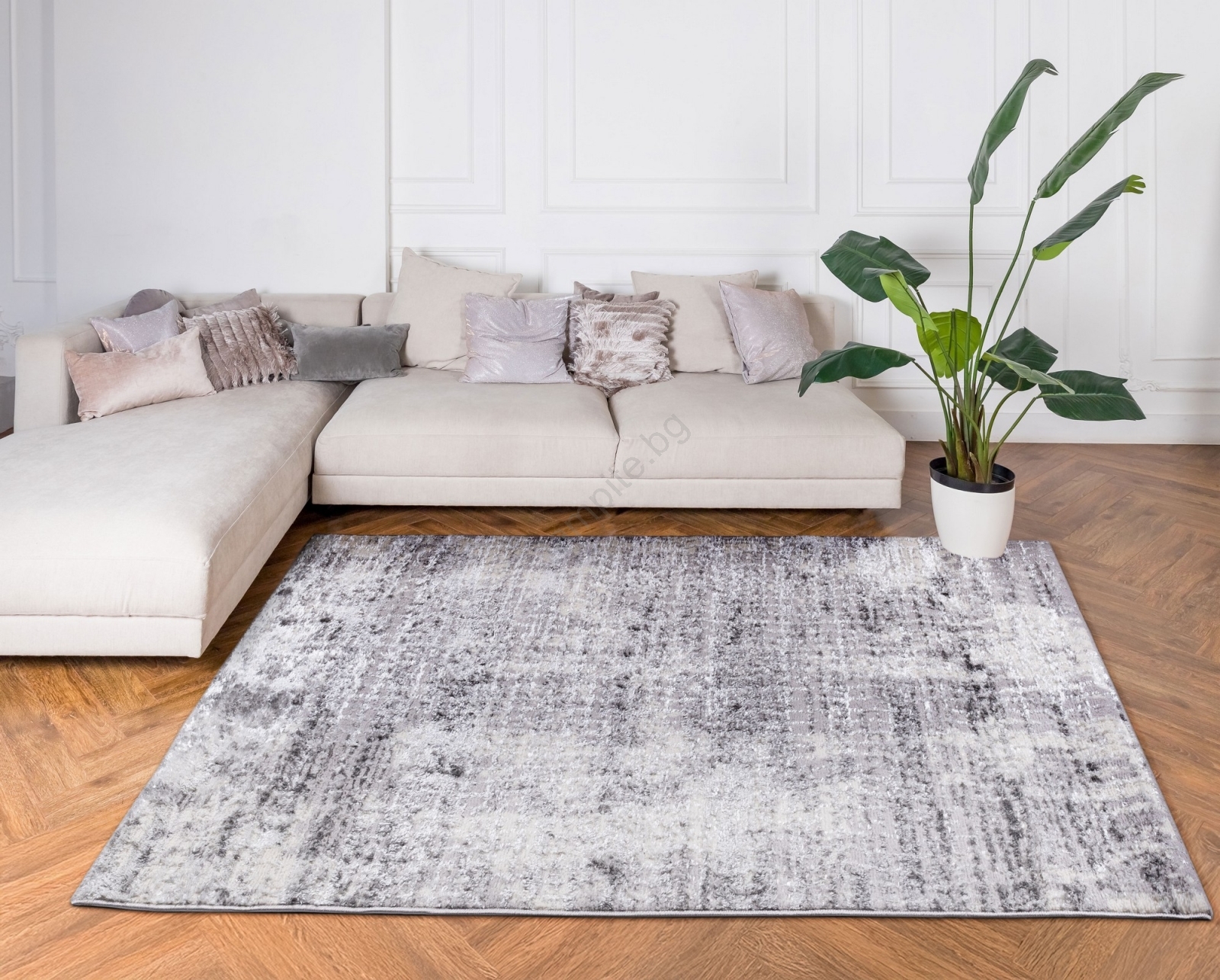• Има абстрактен десен в сив цвят, който перфектно допълва минималистичния декор.
