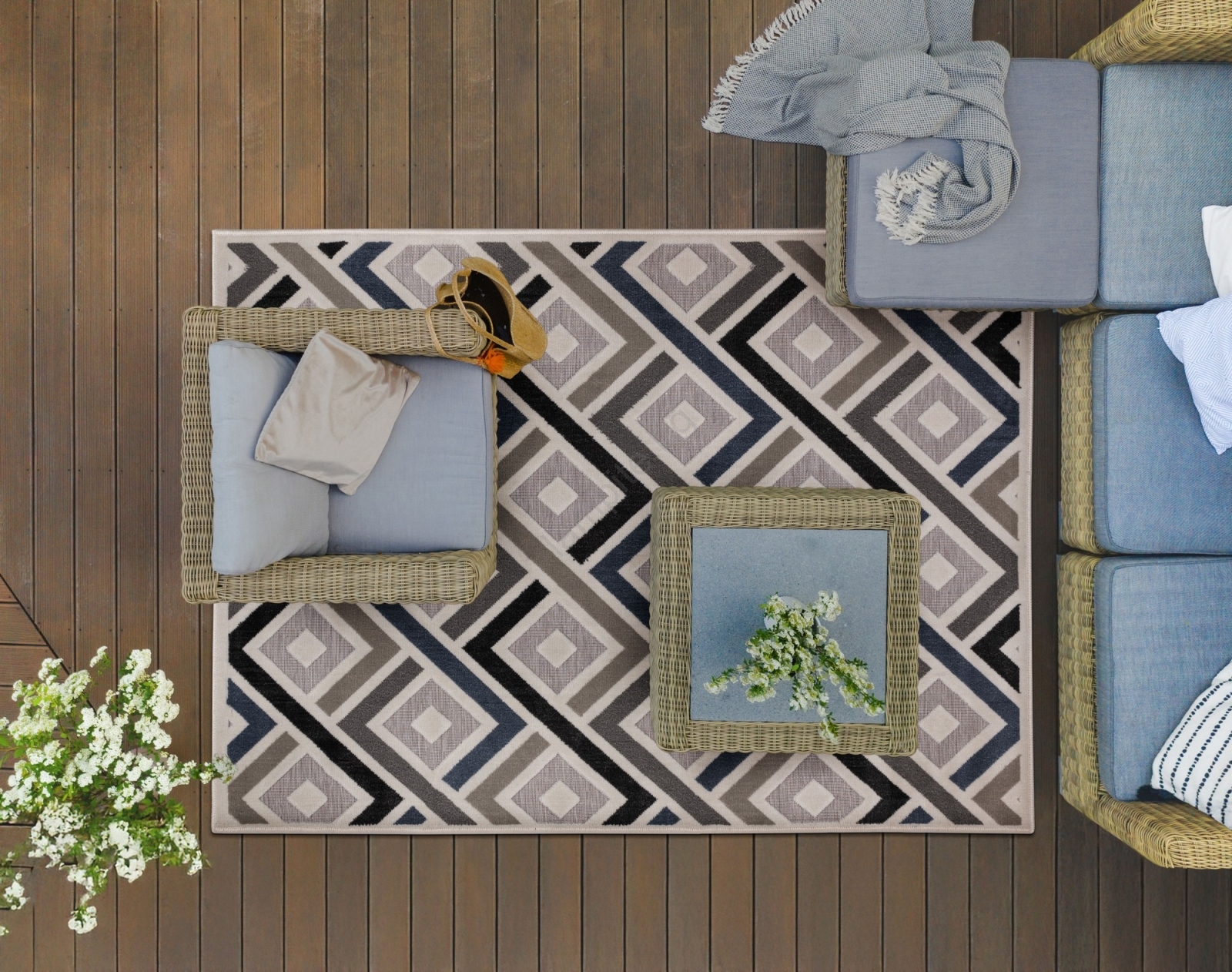 • Стилен и елегантен килим с геометрични мотиви — перфектен за модерни интериори.
