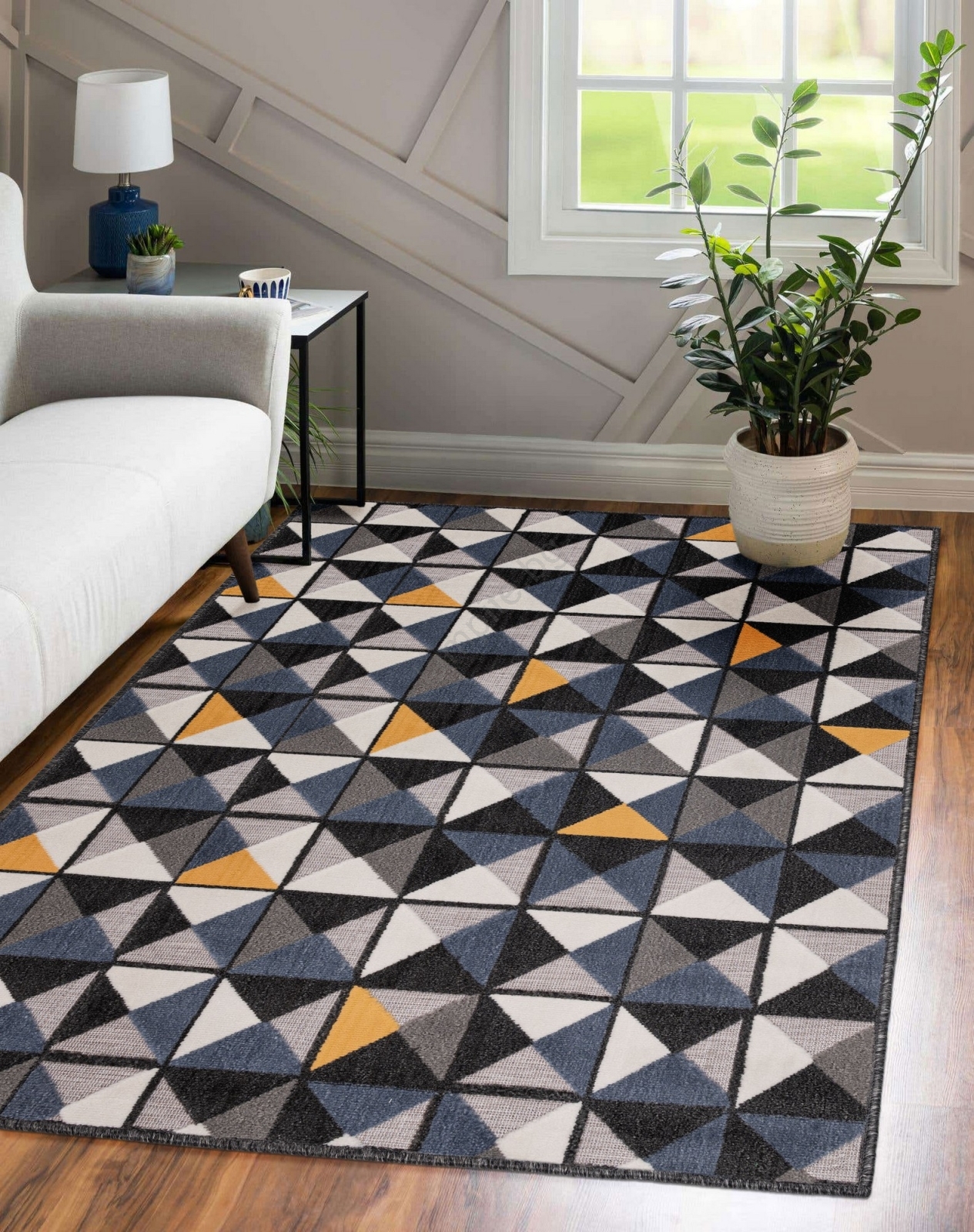 • Стилен и елегантен килим с геометрични мотиви.