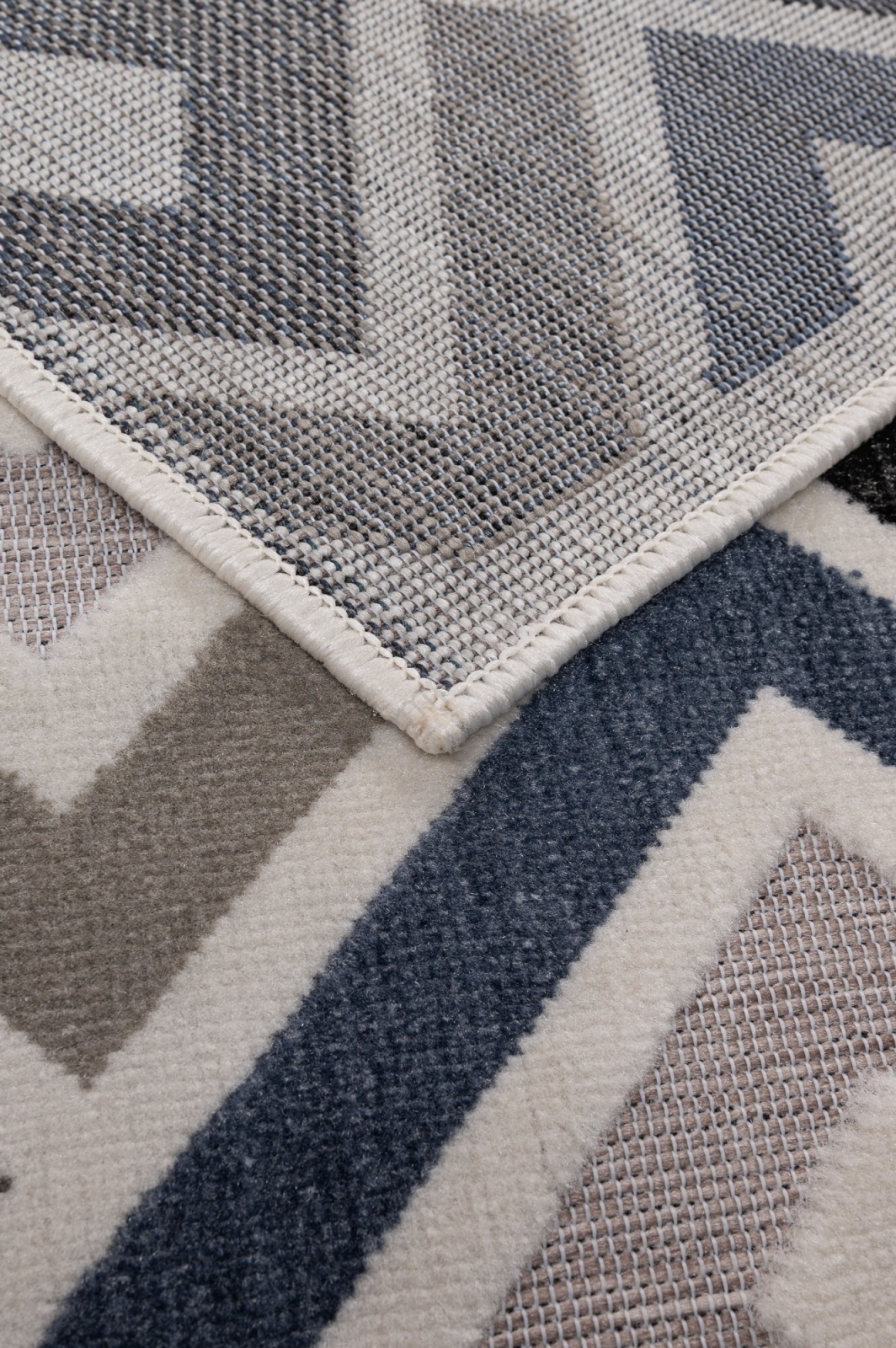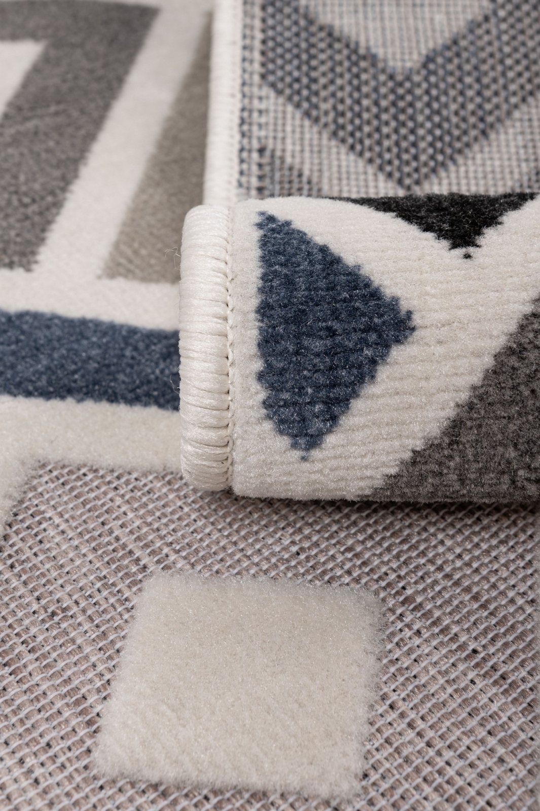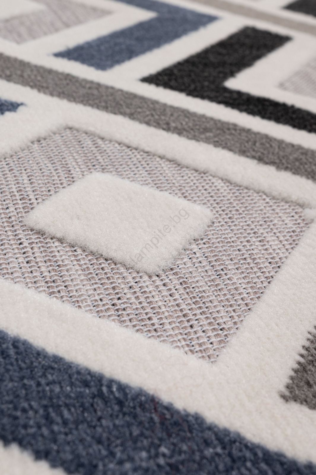 • Купчината е с модерен геометричен мотив и варираща височина, придаваща на килима 3D ефект.