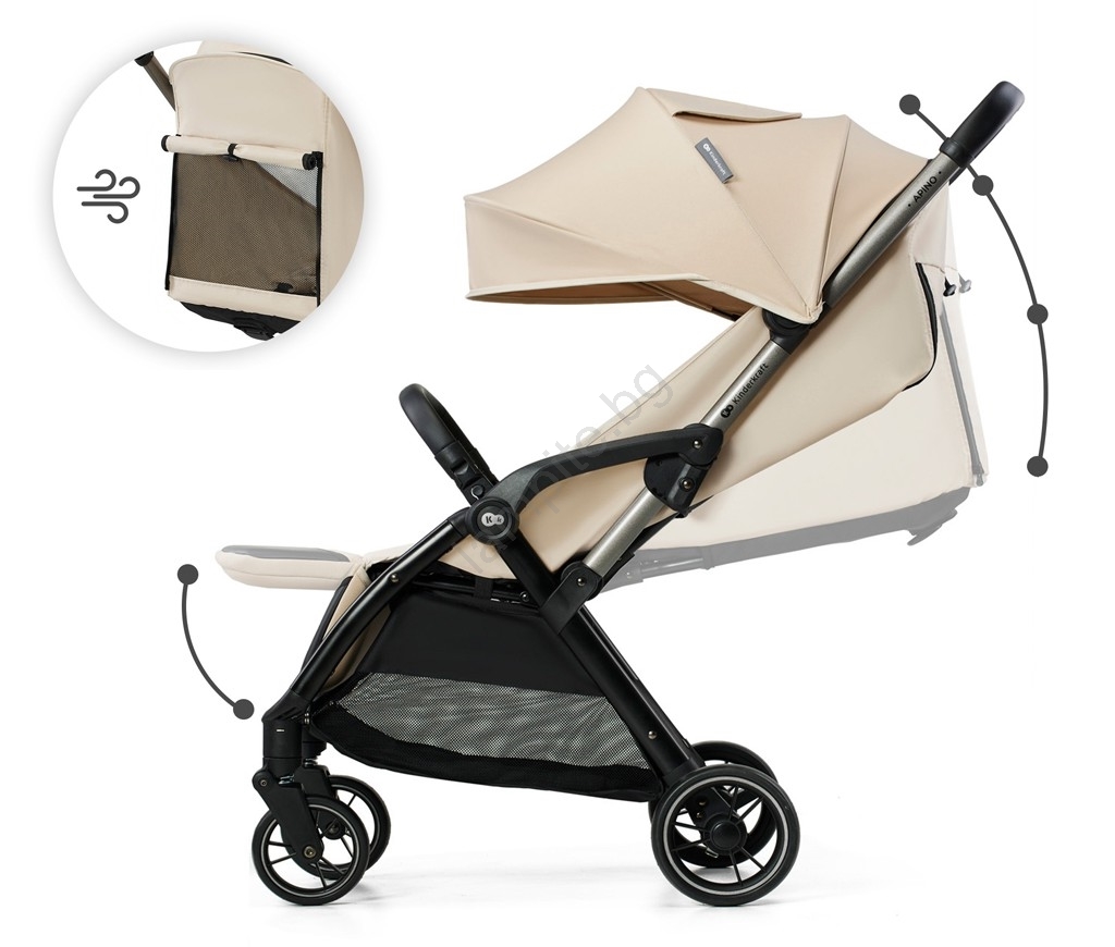 • Голяма сенник с вентилационен панел и прозорче за контакт с детето.