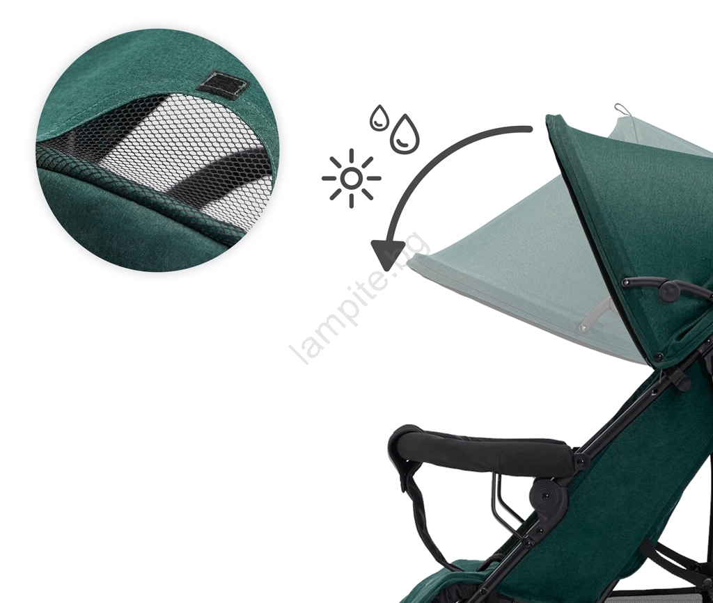 • Разгъваемият сенник осигурява сянка и защита, оборудван е с прозорче за лесен контакт с детето.