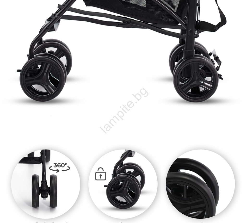 • Предните колела могат да се заключат за по-труден терен и имат амортисьори за по-гладко возене.