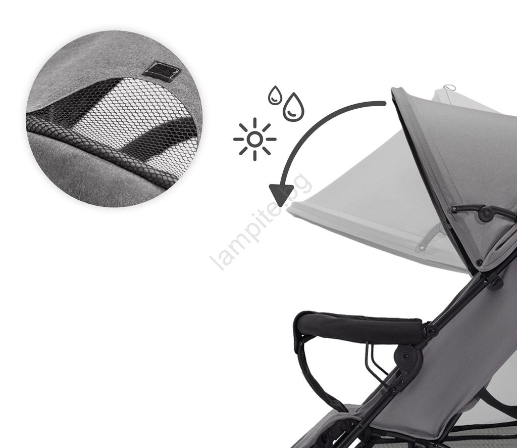 • Разгъваемият сенник осигурява сянка и защита, оборудван е с прозорче за лесен контакт с детето.