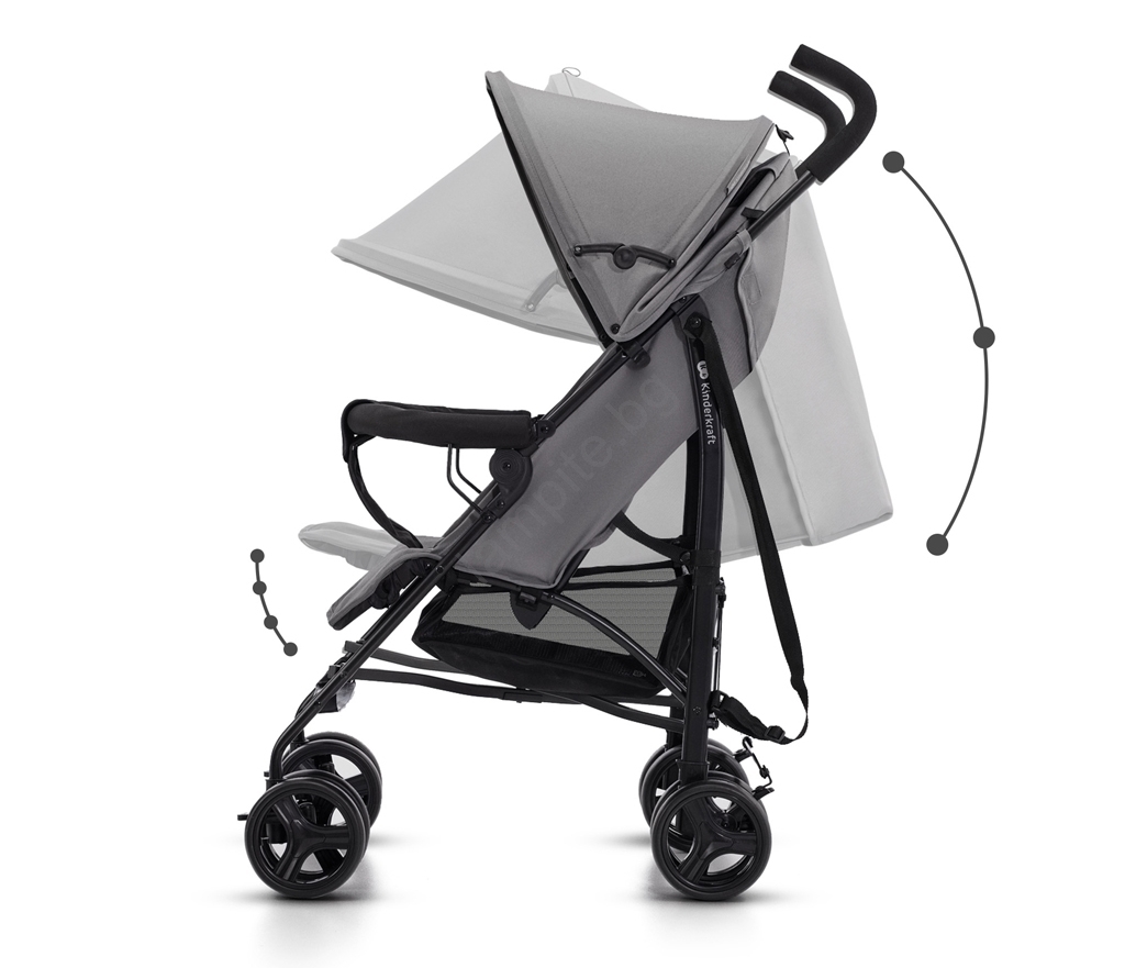 • Регулируемата облегалка за гръб осигурява комфорт на детето, като може да се наклони до легнало положение, а регулируемата поставка за крака допълнително увеличава удобството.