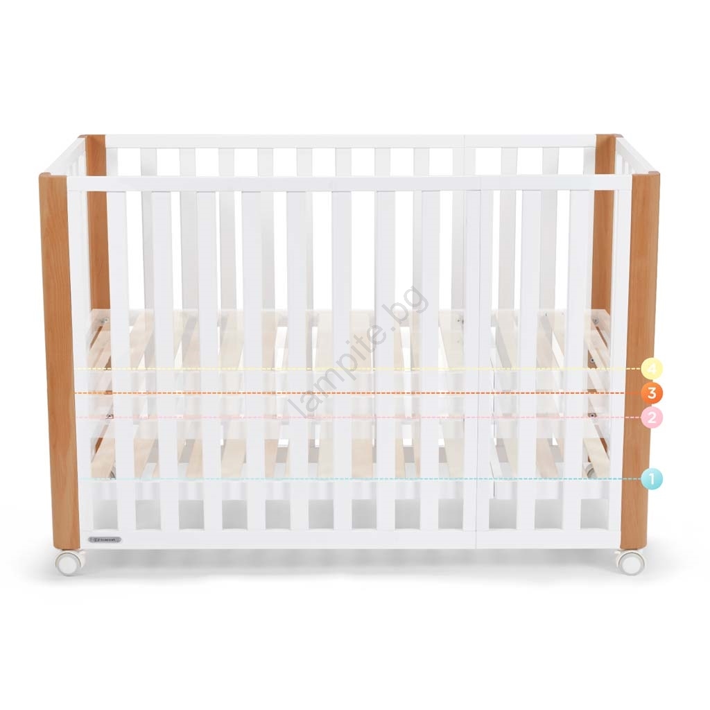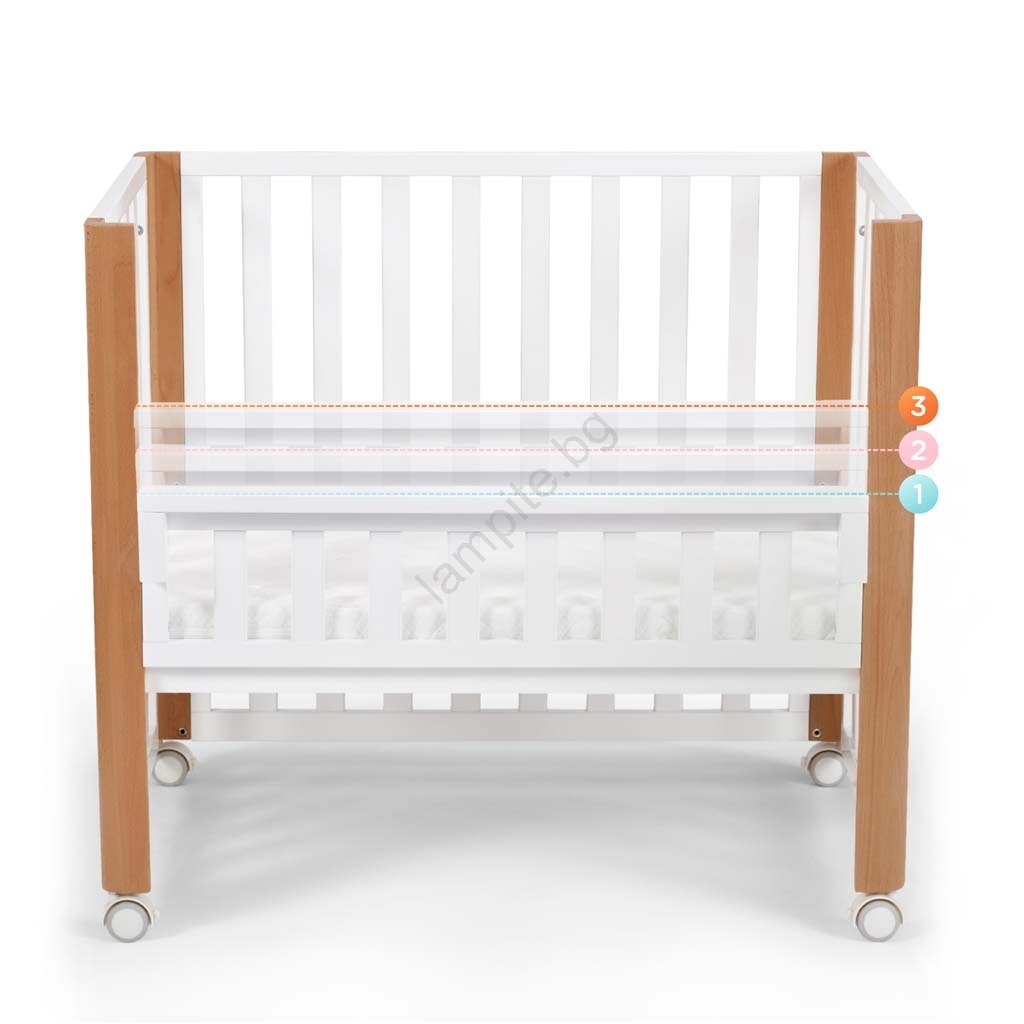 • Регулируема височина на дъното: 3 нива при приставното легло и 4 нива при леглото.