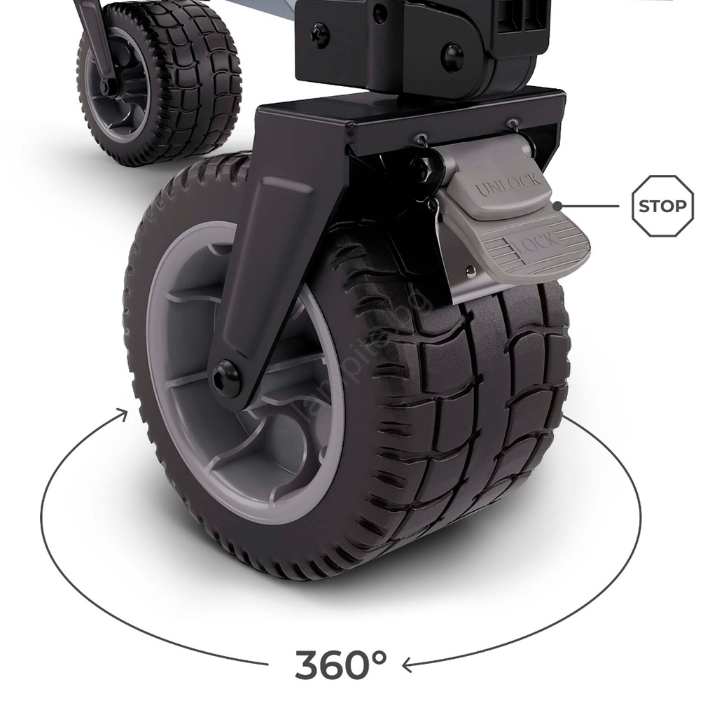 • Големите всъдеходни PVC колела с ширина 10 см лесно се справят с пясък, трева и чакъл, като запазват стабилността на количката дори на неравни повърхности.