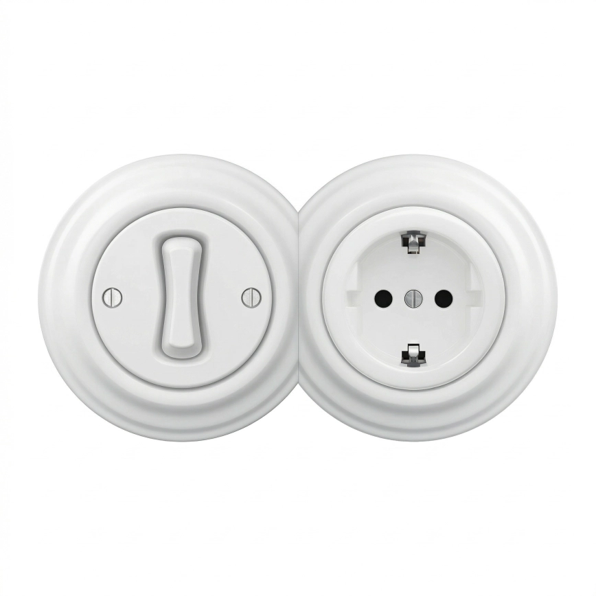 • Kliklap - Ретро еднополюсен ключ №1 и SCHUKO контакт 230 V с рамка, керамично бял