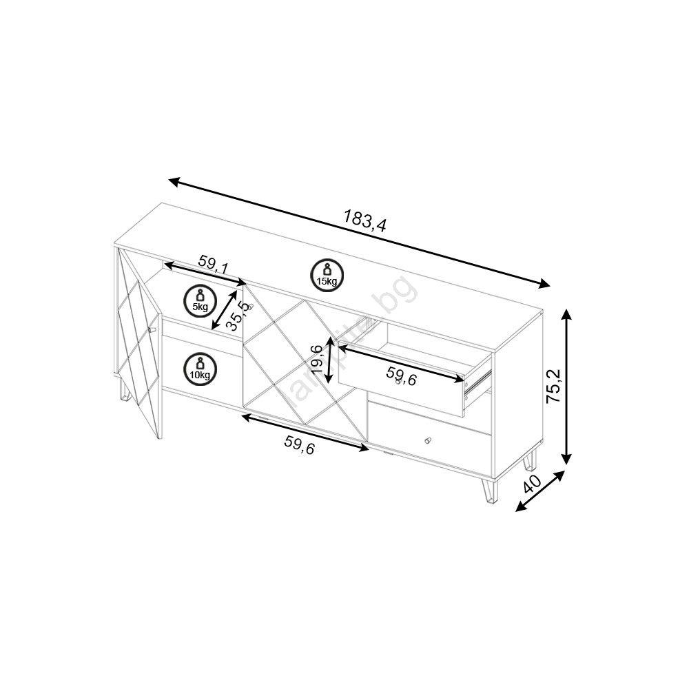 • Има две врати отляво и три чекмеджета отдясно за удобно и прегледно съхранение.