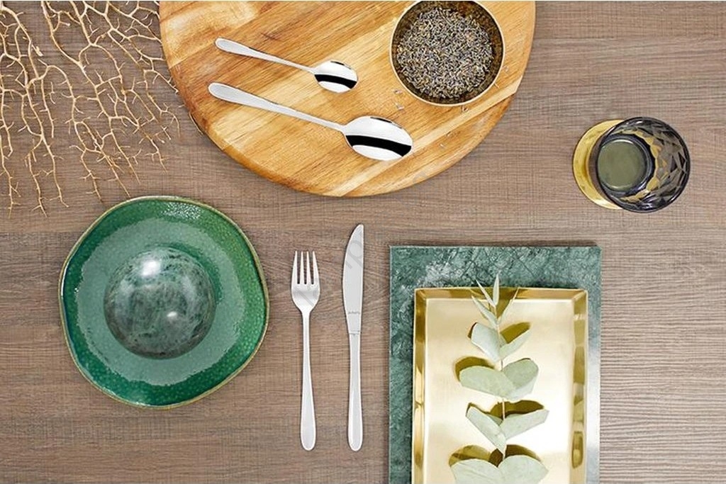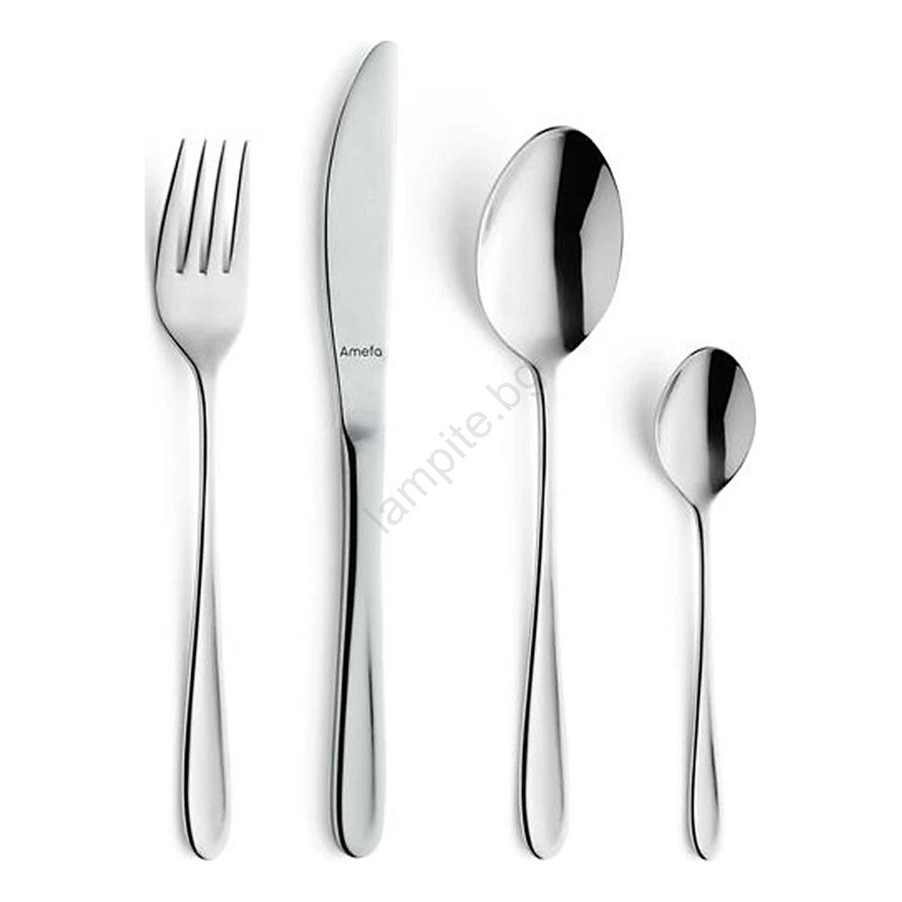 • Комплект прибори за хранене от неръждаема стомана в бляскав хромиран цвят.