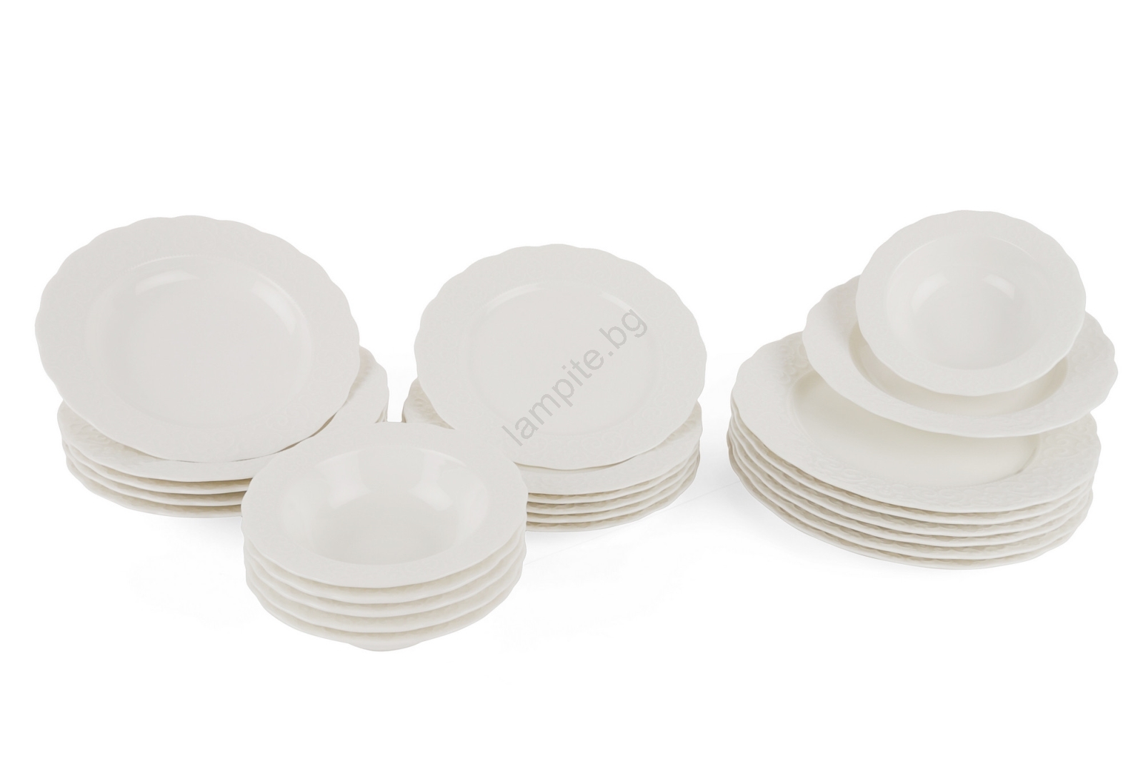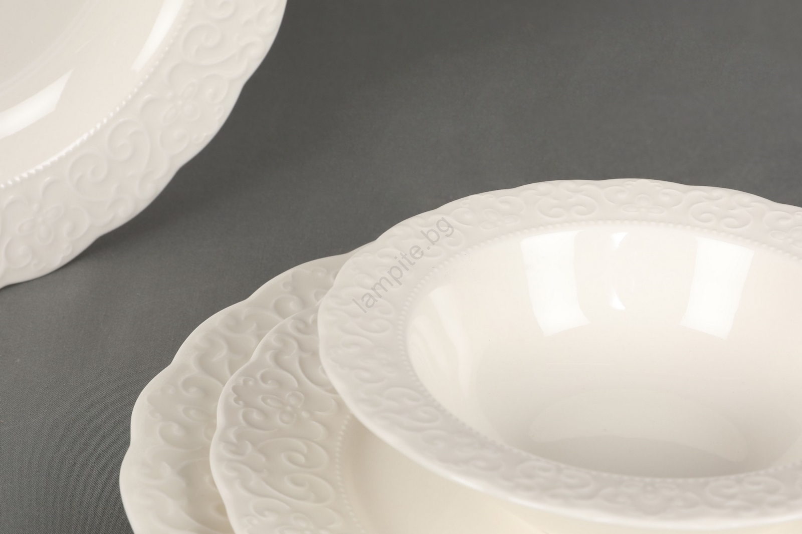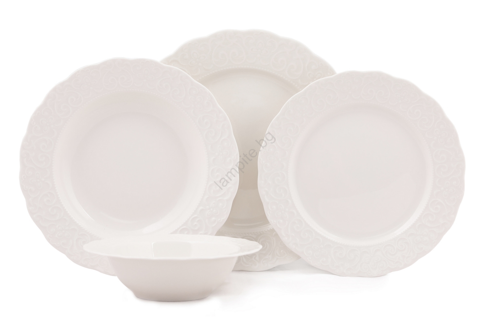 • Елегантен комплект сервиз за хранене, подходящ както за ежедневни трапези, така и за празнични поводи.