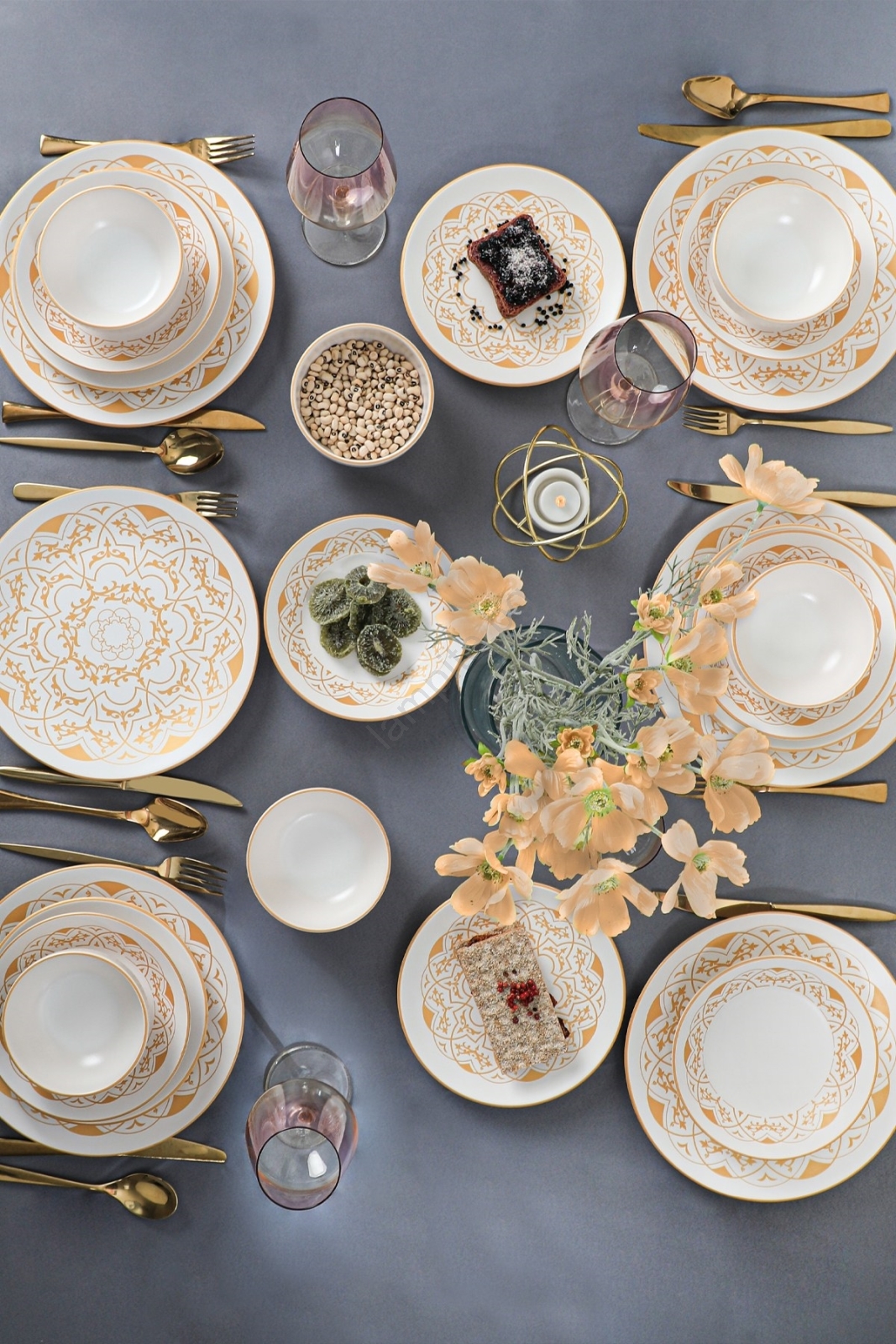 • Елегантен комплект съдове за хранене, подходящ както за ежедневни хранения, така и за празнични поводи.