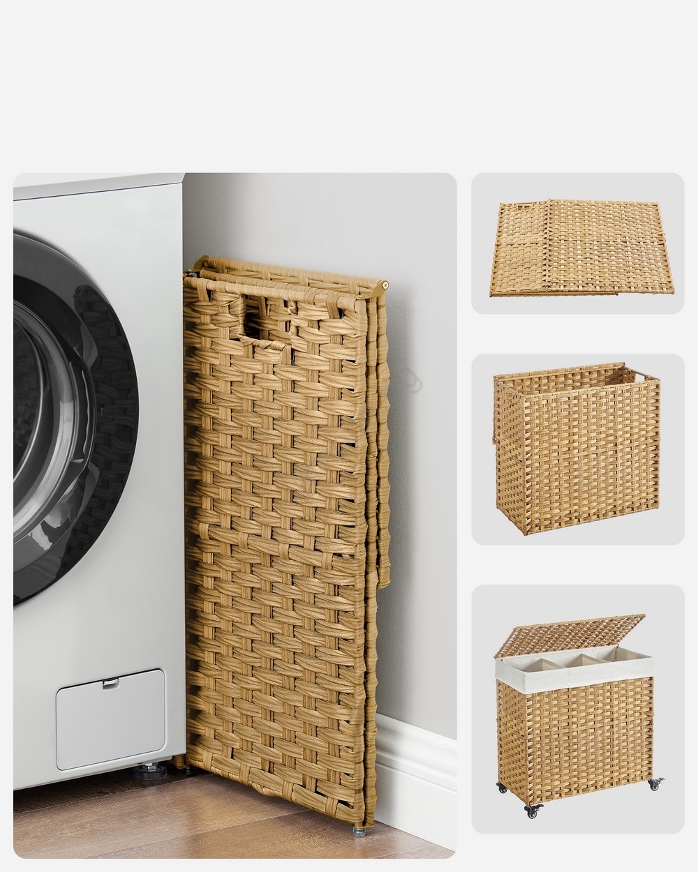 • Внимателно изработеният, ръчно тъкан кош за пране от синтетичен ратан е незаменим детайл за скриване на мръсното пране и поддържане на перфектен ред във вашия дом.