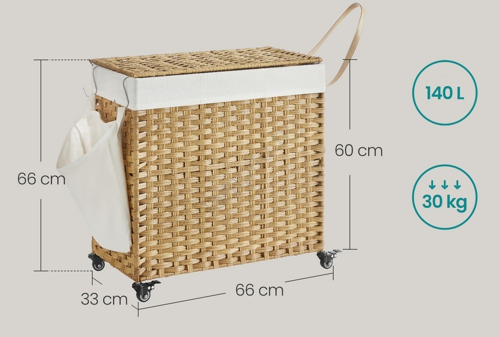 • Кошът за пране има голям капацитет - 140 литра за вашето облекло, хавлии и спално бельо.