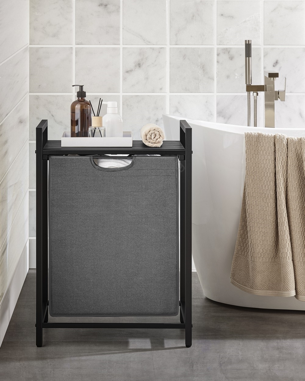 • 1 чувал, 1 полица – Поставете дрехите в платнения чувал (65 l) и подредете перилни препарати, омекотител и други артикули на полицата над него.