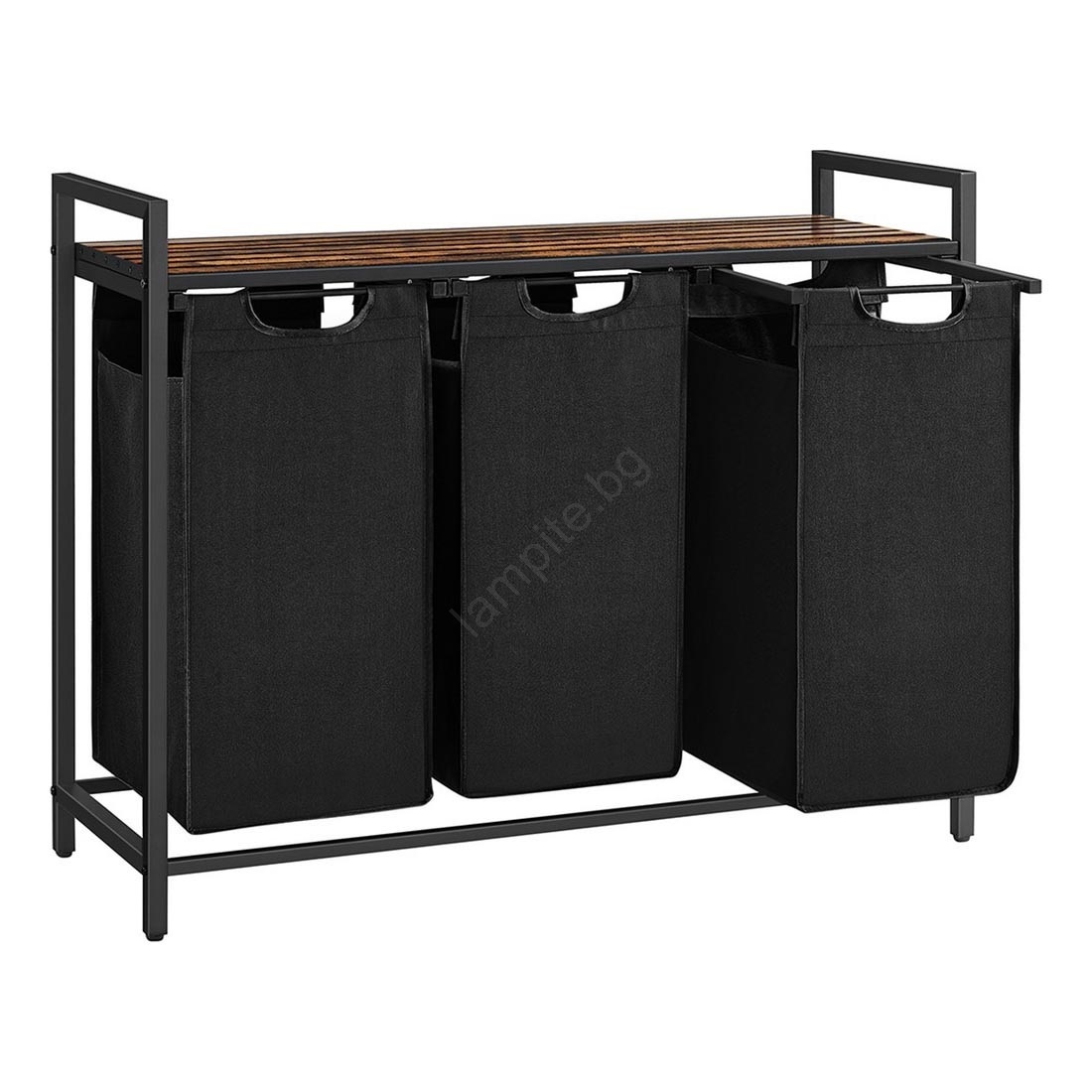 • 3 платнени торби, 1 рафт – Разпределете прането в три платнени торби (38 l всяка) и поставете перилни препарати, омекотител и други вещи на рафта.
