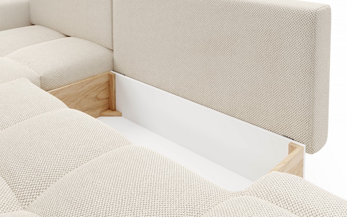 • Разтегателен тапициран ъглов диван ALMADA, L-образен, с ракла за съхранение, дясна, светло бежов