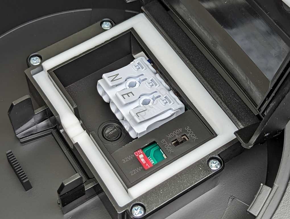• Свързването на осветителното тяло се улеснява от лесно достъпна безвинтова клемна кутия.