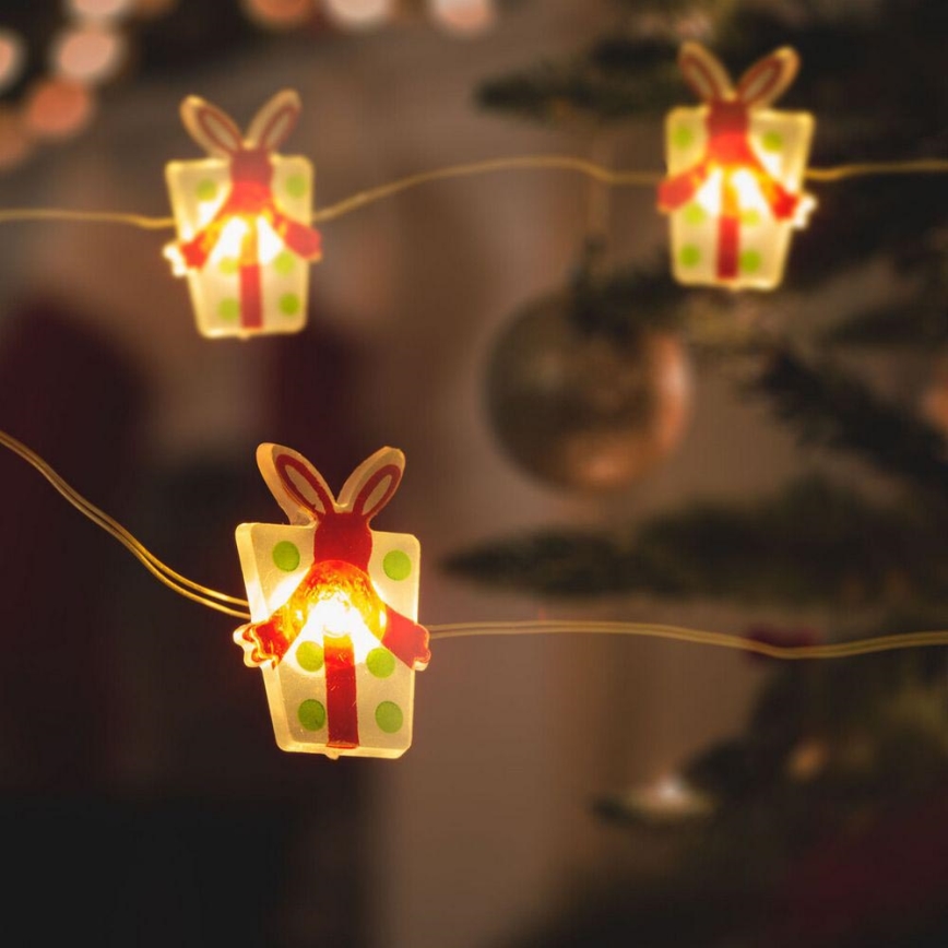 • Декоративна LED верига със светлинни точки под формата на коледни подаръци.