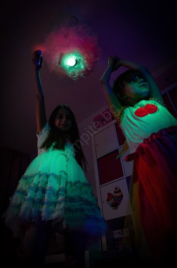 • Предлага четири цвята светлина – бяла, червена, зелена и синя – както и функция мигане, която ще озари всяко детско тържество или вечерна игра.