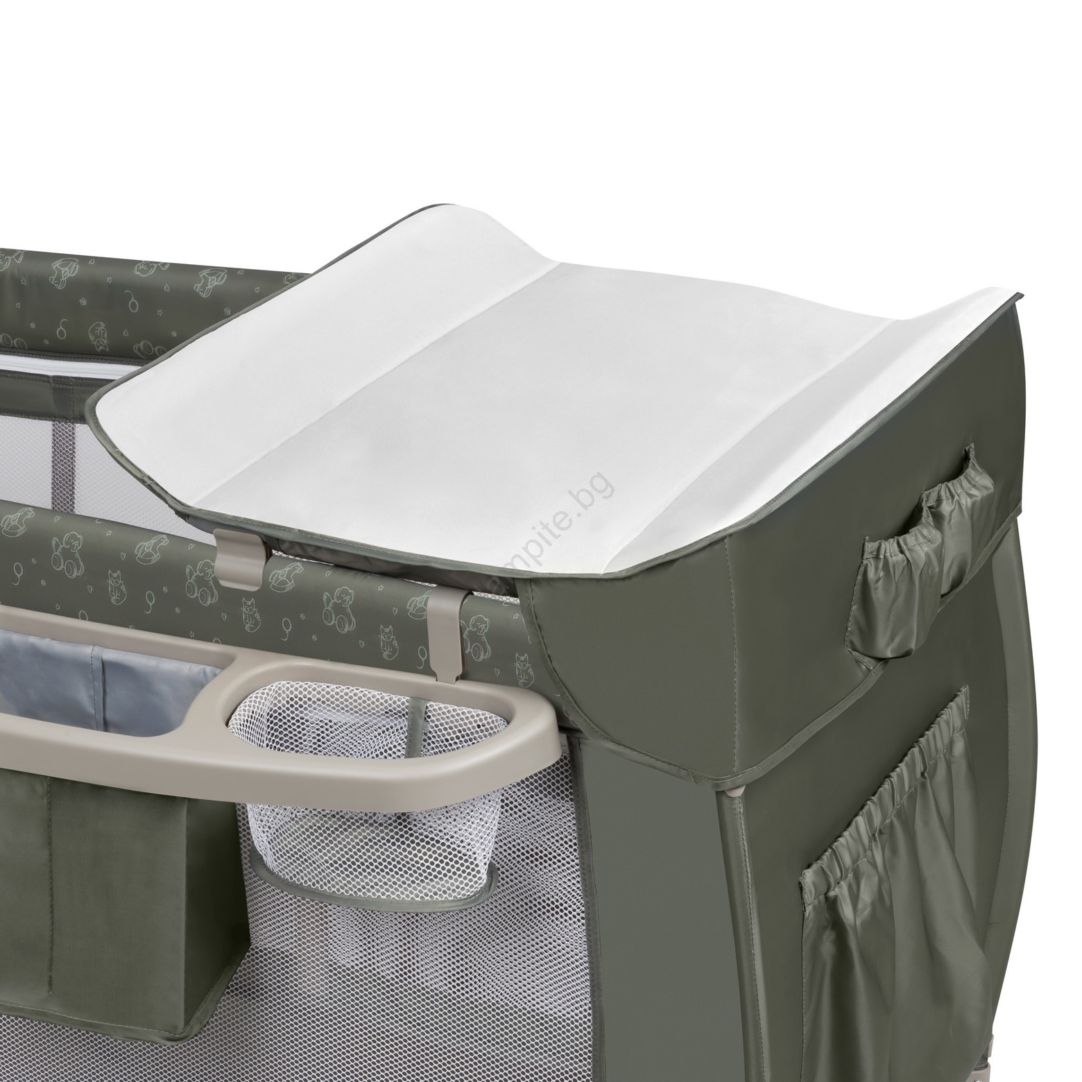 • В комплекта: пеленална маса с странични джобове (за пелени, пудра и др.), кош за аксесоари с две отделения, голяма москитна мрежа, сенник и арка с плюшени играчки.